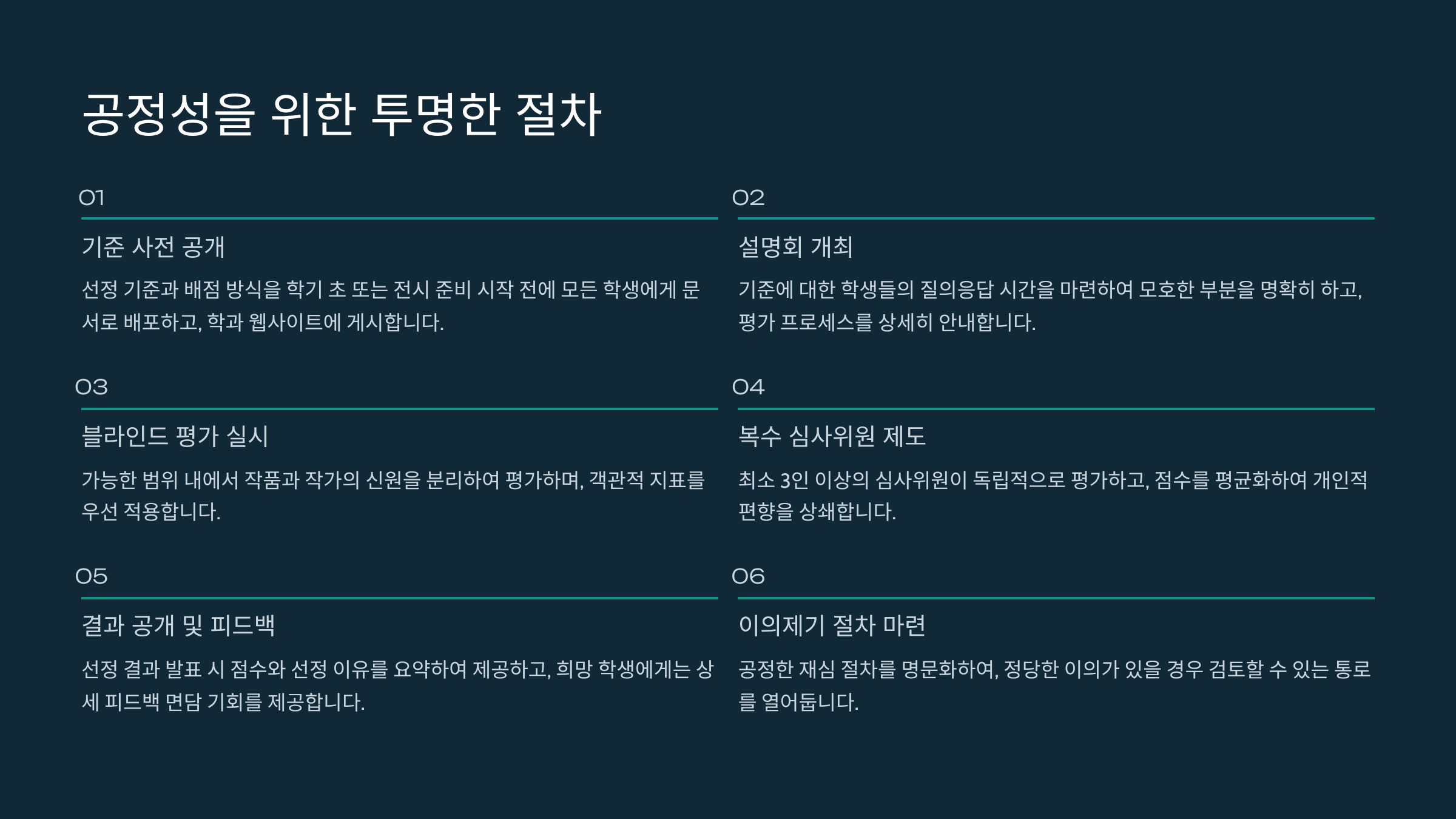 또한 심사위원 전원의 명단을 사전에 공개하고, 어떤 항목을 어떤 기준으로 평가할지를 명확히 공지하면 심사 결과에 대한 수용성이 훨씬 높아져요. 심사 후에는 간단한 피드백도 남겨주면 학생들에게도 큰 도움이 되죠.
