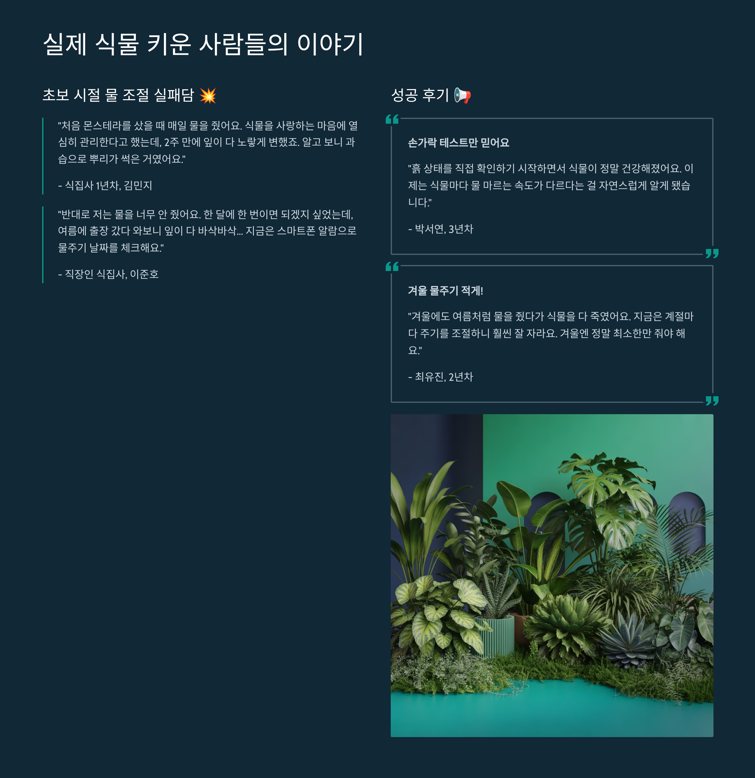| A (몬스테라) | 매일 물 줘서 과습 유발 | 10일간 물 주기 멈춤 | 건강하게 성장 중 |