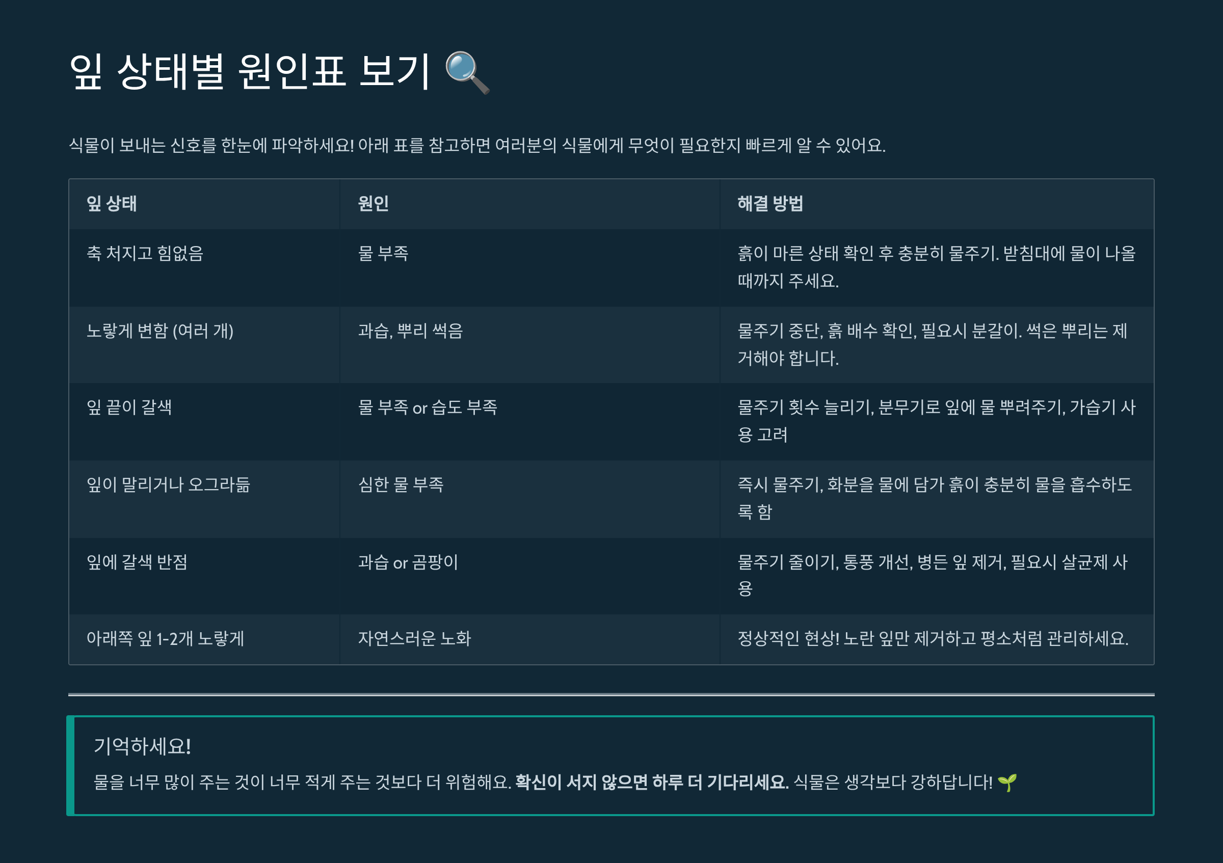 이 표만 기억해도 물주기 실수는 훨씬 줄어들 거예요. '잎 상태 → 원인 추측 → 대처' 이 3단계만 익혀두면, 초보 딱지를 뗄 수 있는 날도 가까워진답니다! 🌿✨