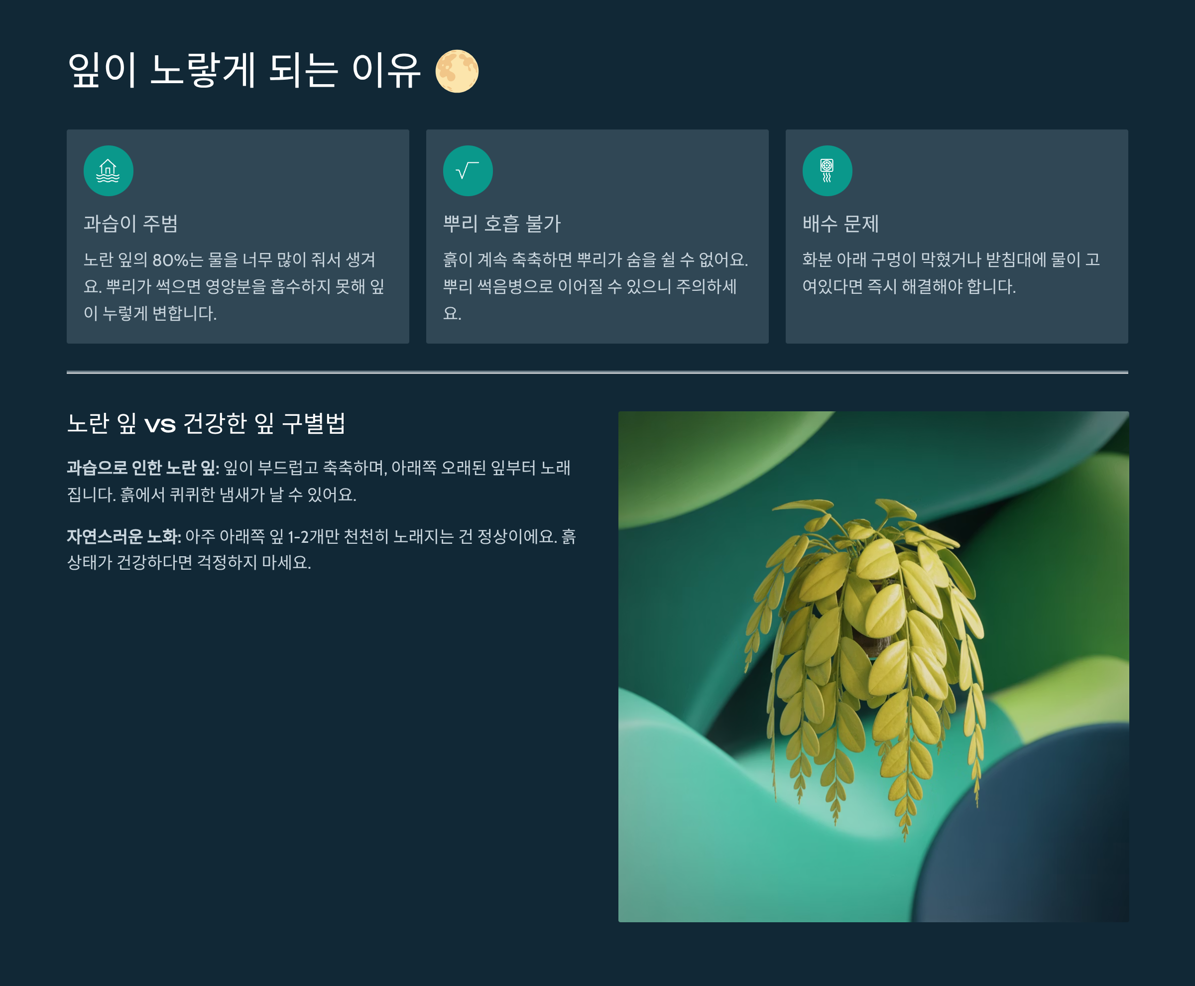 식물의 잎은 말 그대로 ‘신호등’이에요. 어떤 잎은 축 늘어지고, 어떤 잎은 노랗게 물들고, 또 어떤 잎은 갈색으로 바스러지죠. 이런 현상들은 식물이 보내는 구조 요청이에요. 이걸 정확히 알아차리면, 물이나 햇빛, 통풍 상태까지 빠르게 조치할 수 있어요 🛠️
