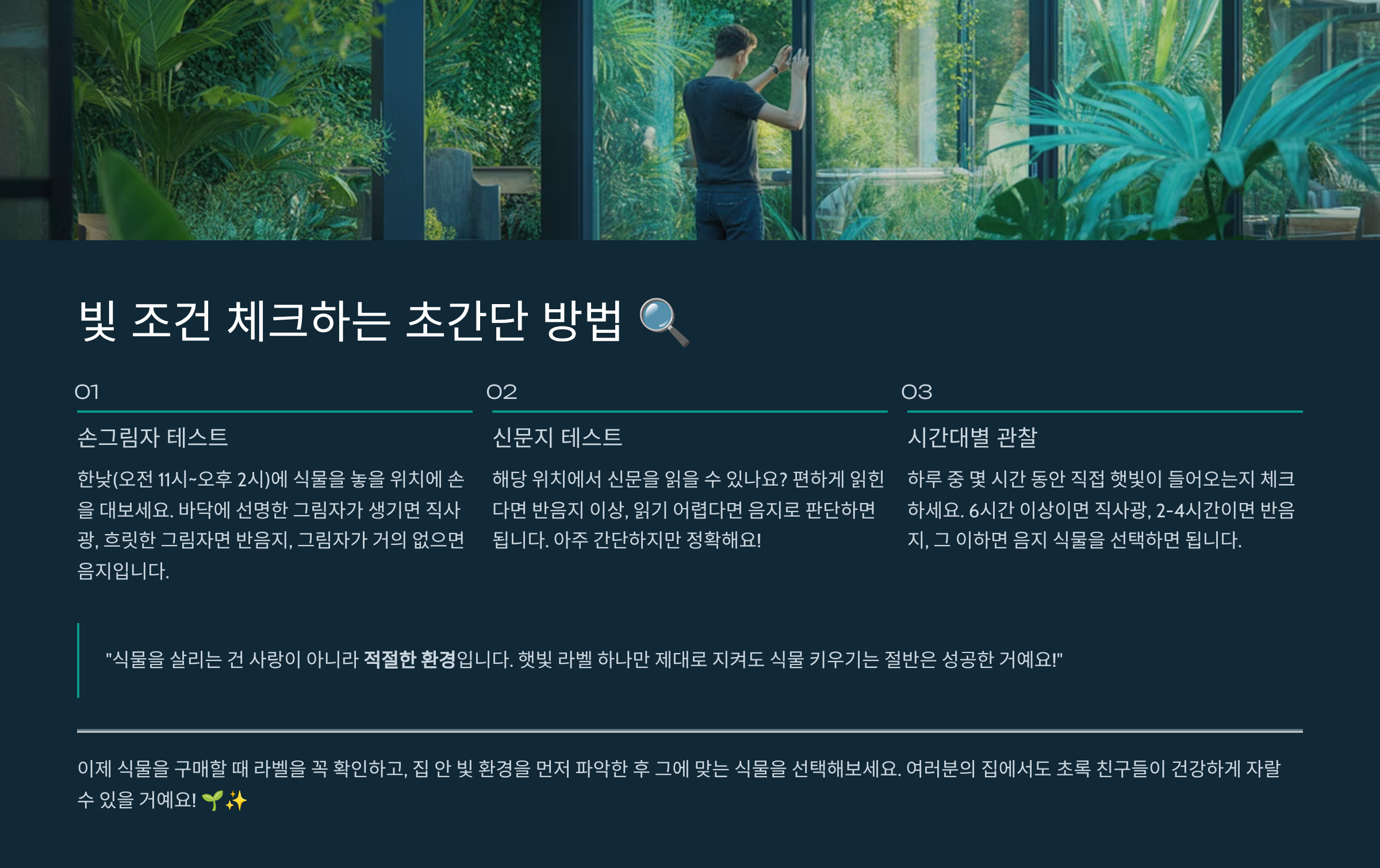 빛 조건을 체크하는 건 식물 배치의 시작이에요. 하지만 특별한 장비나 조도계가 없어도 손쉽게 확인할 수 있는 방법들이 있어요. 초보자도 바로 따라할 수 있는 초간단 테스트들이라, 오늘 당장 실천해볼 수 있어요 😊