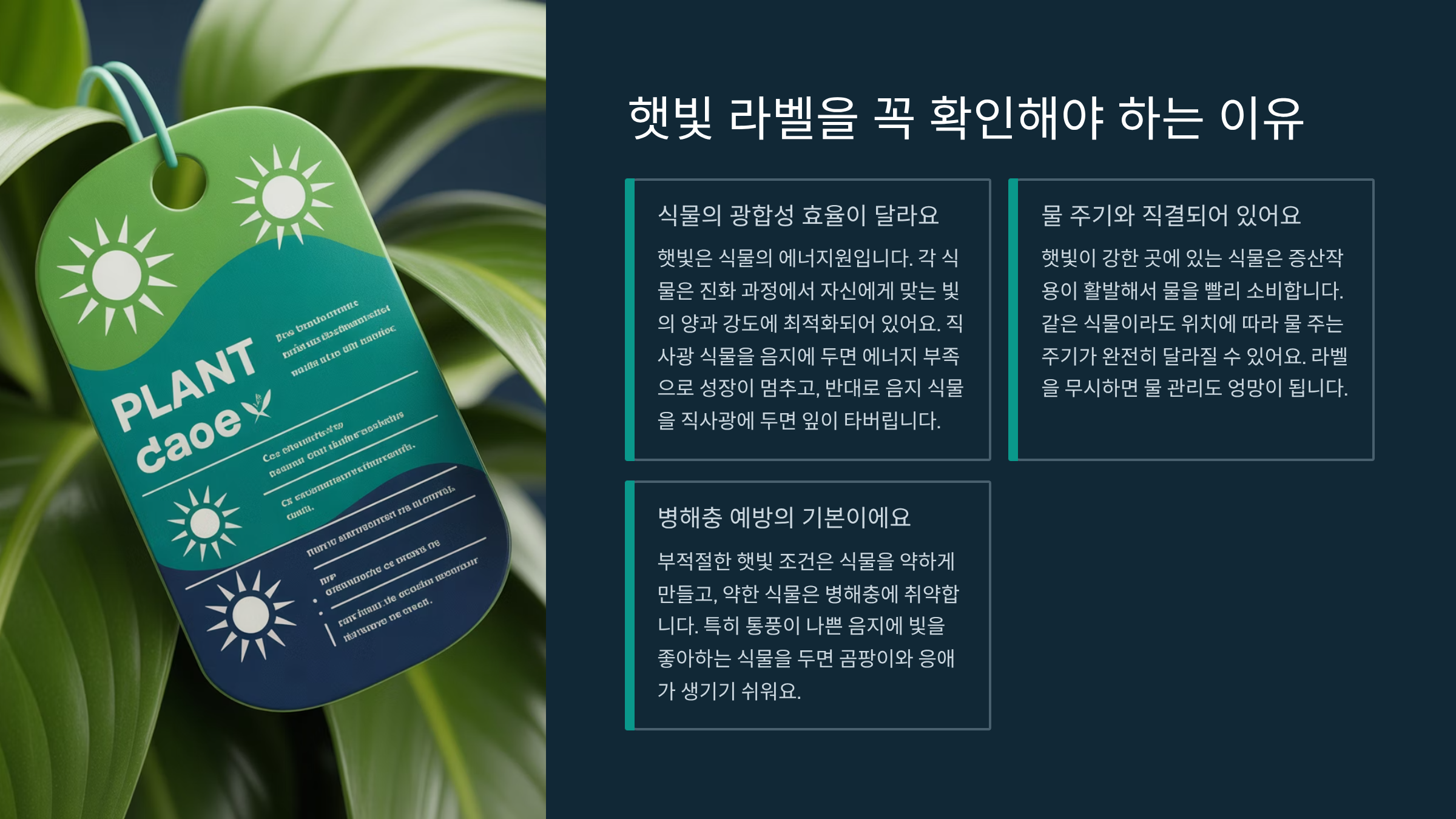 식물마다 태양을 받아들이는 방식이 다르기 때문에, 적절한 광 조건을 맞춰줘야 건강하게 자랄 수 있어요. 라벨을 무시하고 무조건 예쁜 자리에 두면, 잎이 타거나 시들거나 하는 문제가 생길 수 있답니다.