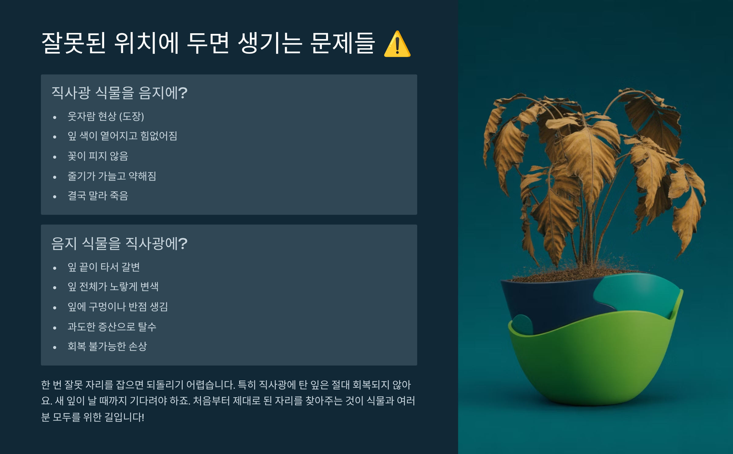 는 거랑 비슷해요. 무심코 무시하고 햇빛 아래 두면, 식물에게는 치명적인 환경이 될 수 있어요.