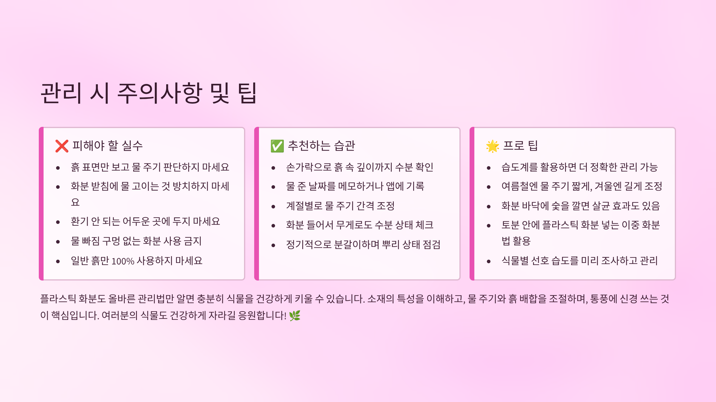 흙이 안 맞으면 어떤 화분을 써도 결과는 같아요. 그래서 식물 잘 키우는 사람들은 먼저 흙을 고르고, 그다음에 화분을 선택한답니다. 이 순서가 성공의 열쇠예요! 🔑