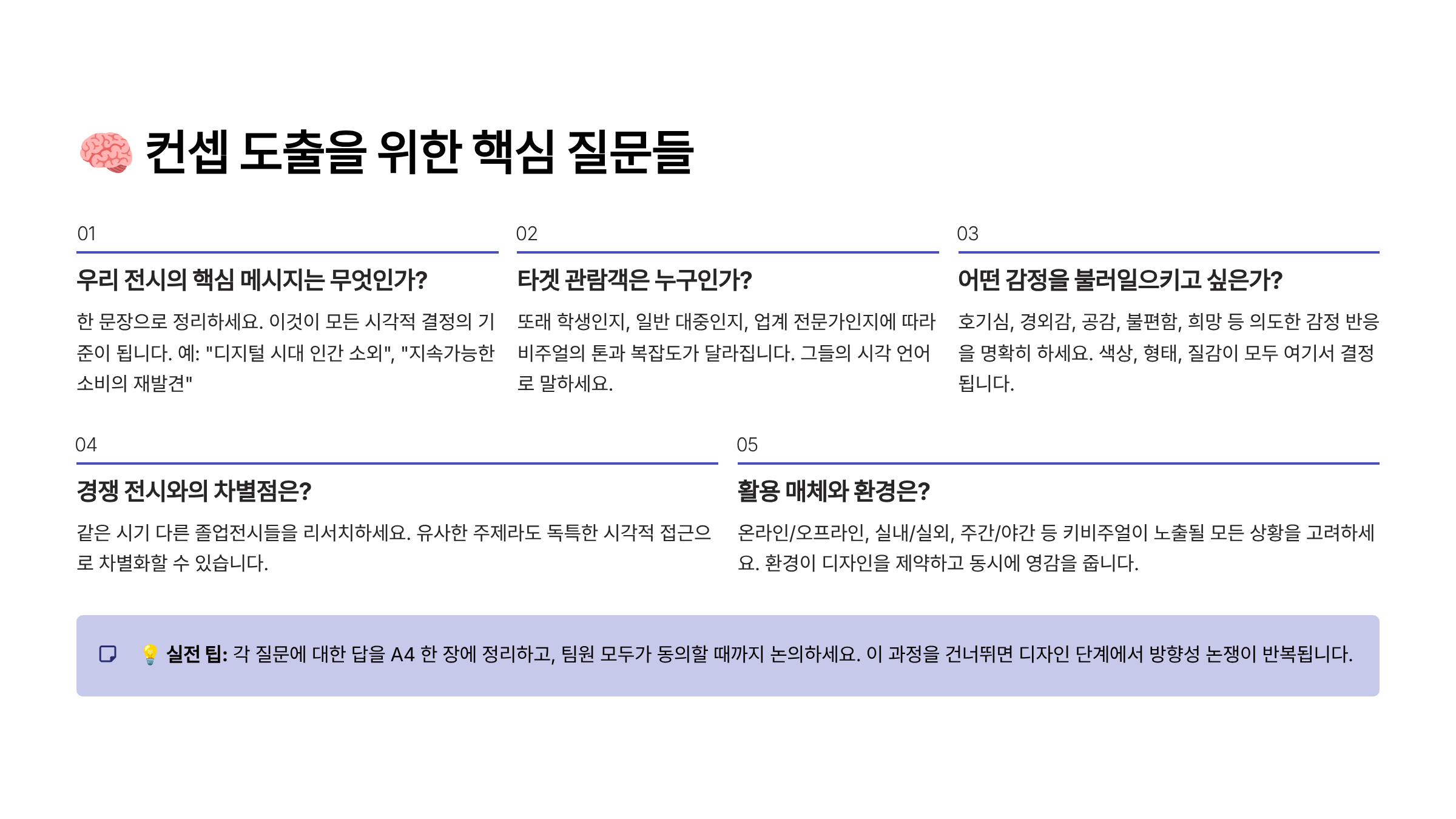컨셉 도출의 시작은 ‘질문’에서 출발해요. 무작정 아이디어를 뽑기보다, 전시의 본질을 꿰뚫는 질문을 통해 핵심 메시지를 정리해야 해요. 이건 마치 브랜드 철학을 찾는 과정과도 비슷하답니다.