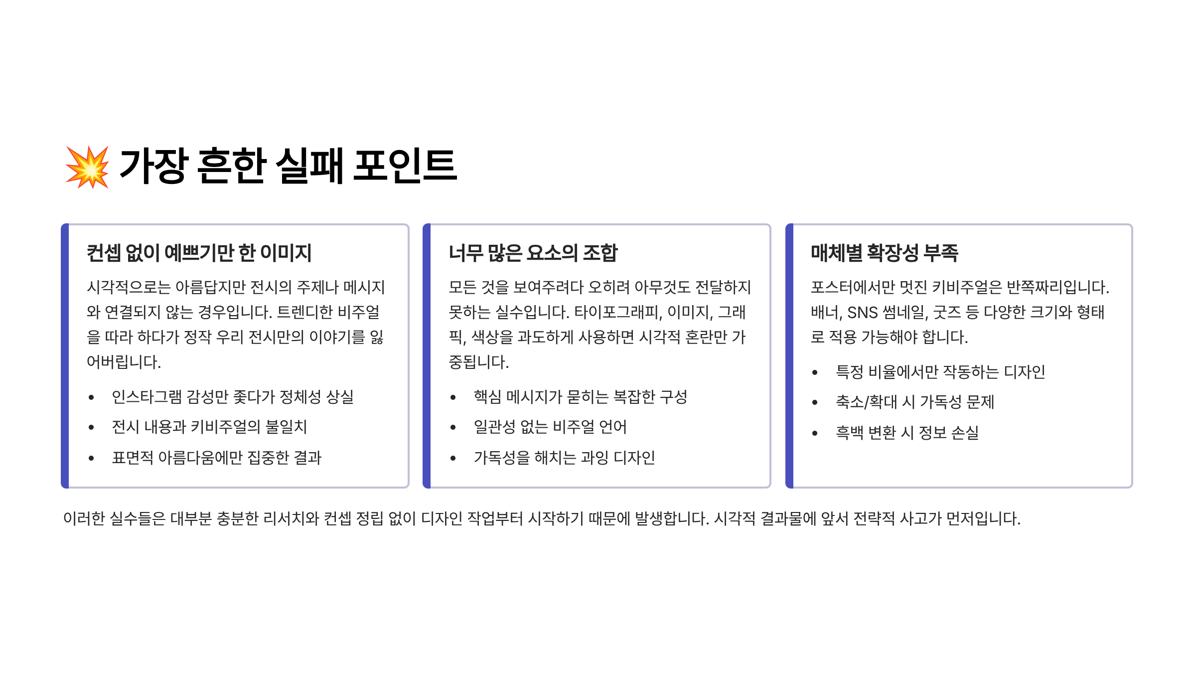 그리고 내부 팀원 간의 컨셉 공유 부족도 실패의 원인이에요. 디자이너만 이해하는 콘셉트는 전시 전체 톤앤매너와 어긋날 수 있어요. 기획자, 작가, 디자이너 모두가 이해할 수 있는 공통 언어가 중요하답니다.