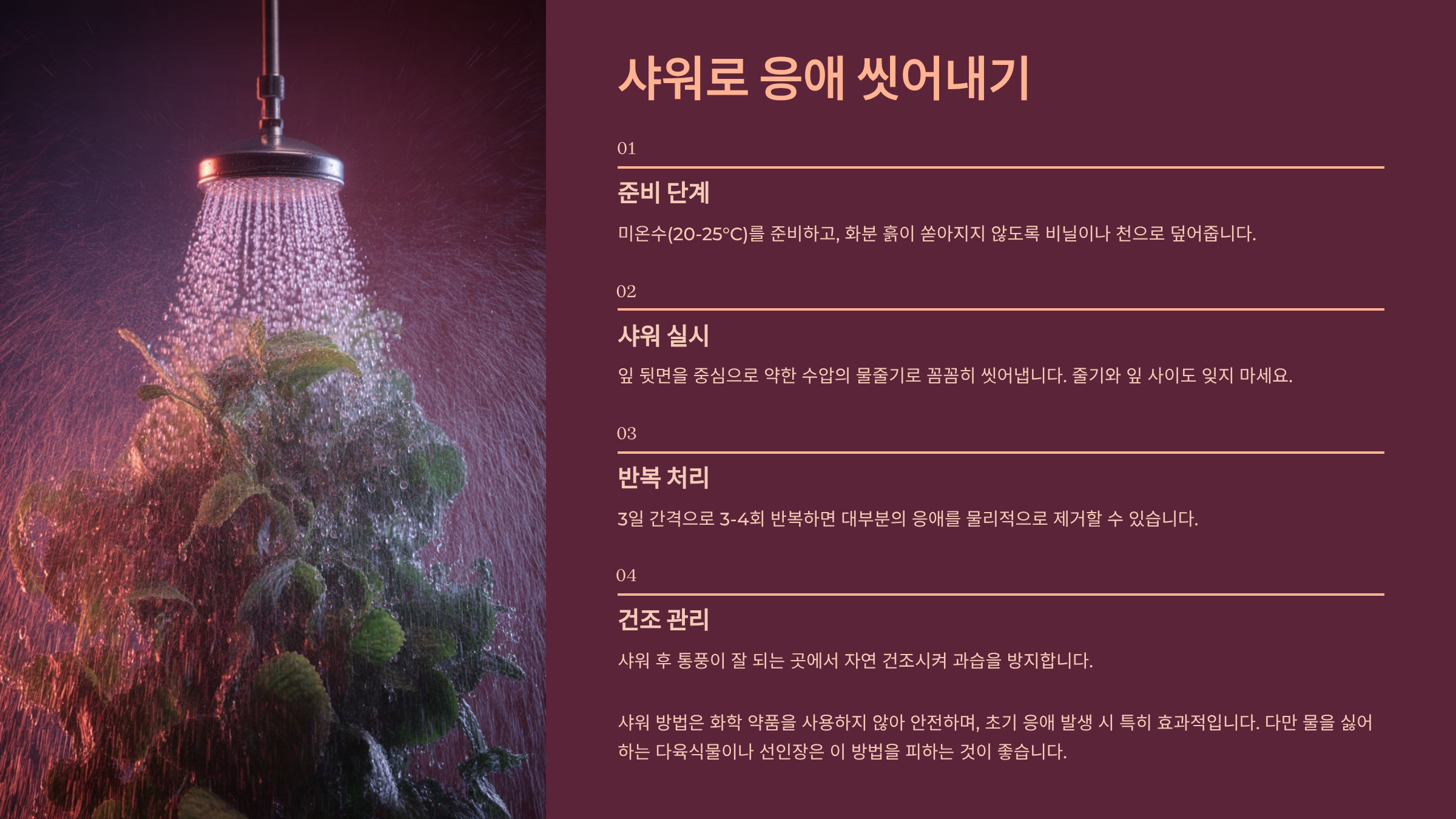 응애는 작고 빠르기 때문에 물살로도 꽤 효과적으로 떨어지지만, 완전 제거는 아니에요. 그래서 샤워 후에도 천연 살충제를 뿌려주는 게 좋아요. 이때 화학약품보다 천연재료를 쓰는 게 식물에도 더 안전하답니다.