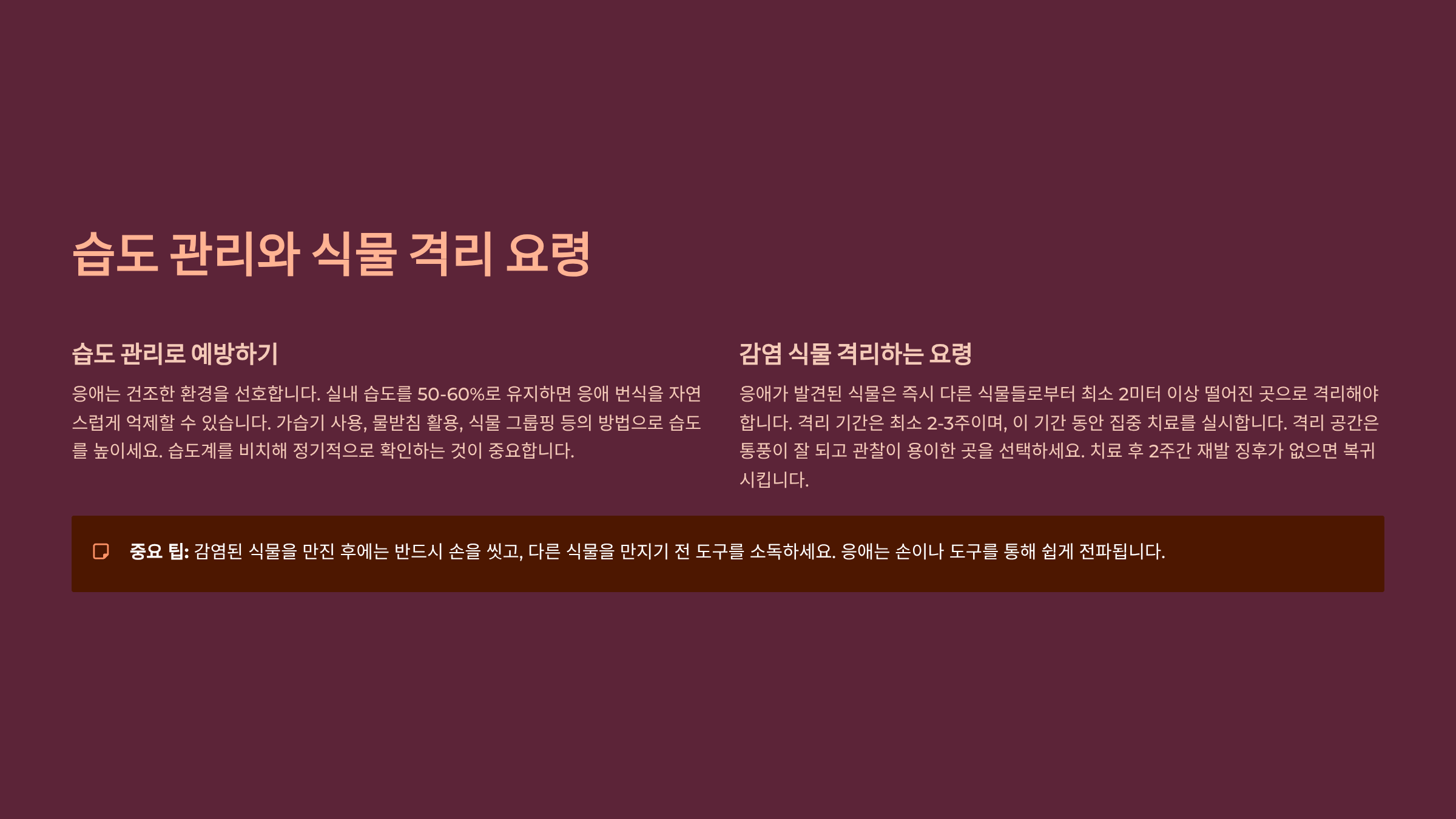 응애가 한 번 생기면 정말 빨리 퍼져요. 그래서 한 화분에서 의심 증상을 발견하면 즉시 격리 조치해야 해요. 단 하루라도 늦어지면 옆 화분까지 피해가 번질 수 있답니다.