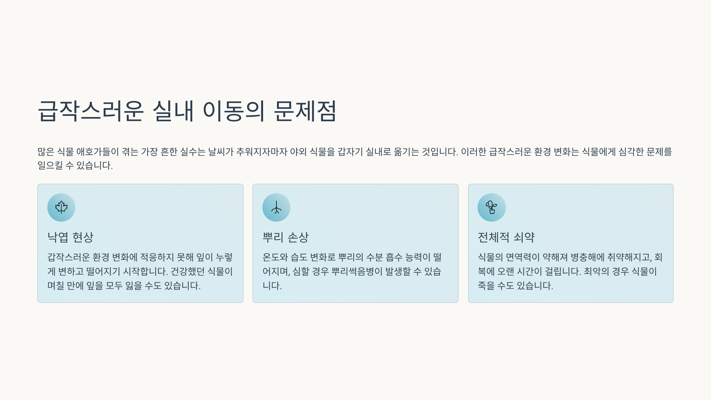 갑작스러운 온도 차는 마치 우리가 따뜻한 방에서 갑자기 영하 10도의 바깥으로 뛰어나가는 것과 비슷해요. 순간적으로 충격이 크기 때문에 식물도 면역력이 떨어지고, 병해충에 쉽게 노출돼요. 이 시점에서 과습이나 뿌리 부패가 발생하기도 해요.