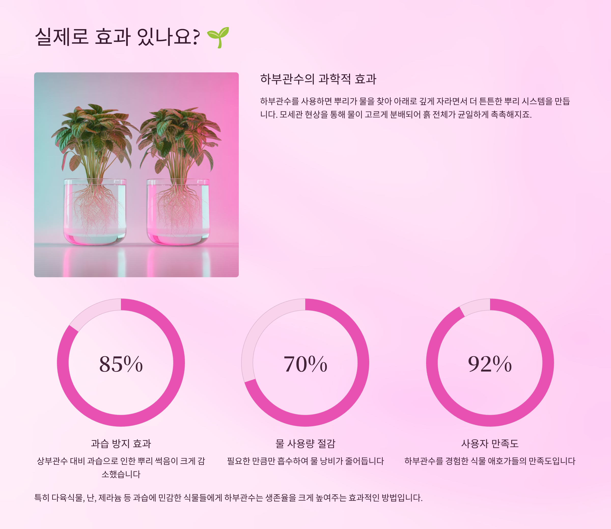 기존의 상부관수는 흙의 표면만 적시기 쉬워 과습이나 뿌리 썩음의 원인이 되는 경우도 많았어요. 하지만 하부관수는 이런 위험을 줄여주기 때문에 더 건강한 생장을 기대할 수 있어요.
