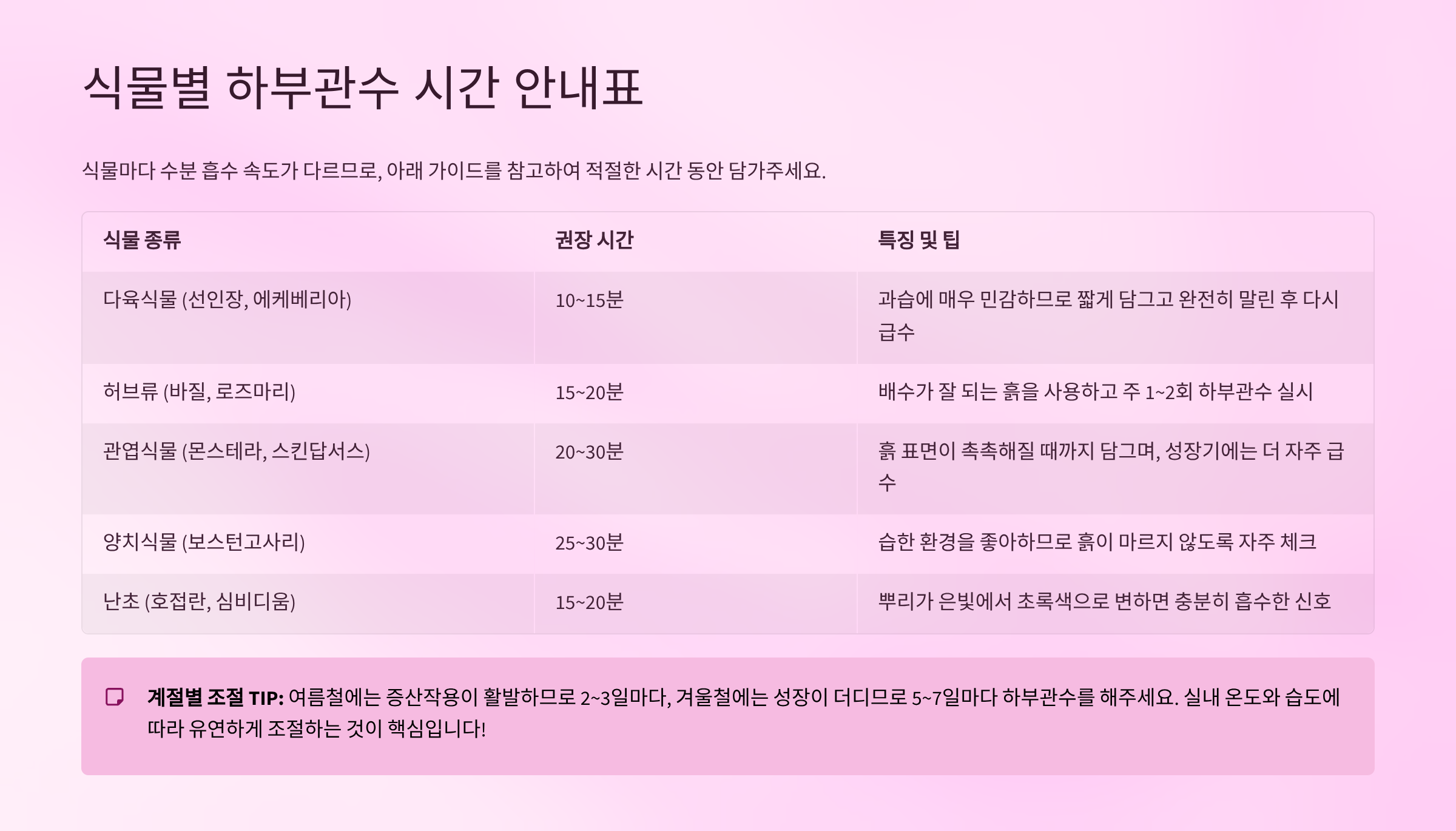 | 식물 종류 | 추천 하부관수 시간 | 주기 |