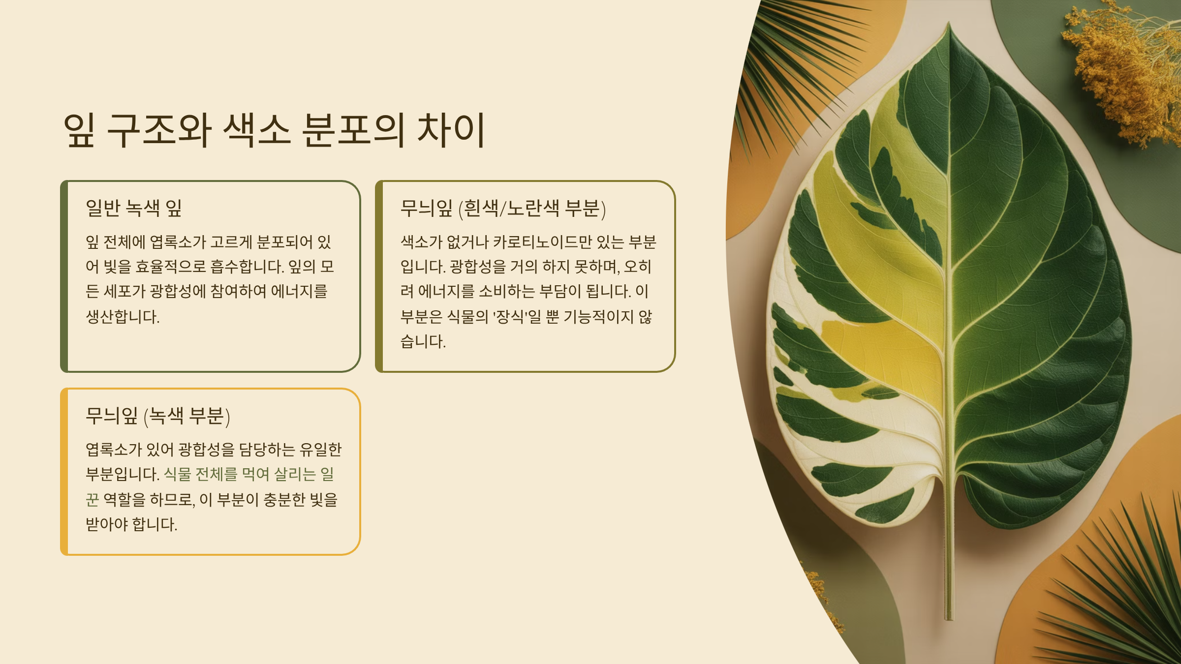 | 구분 | 무늬잎 식물 | 일반 초록잎 식물 |