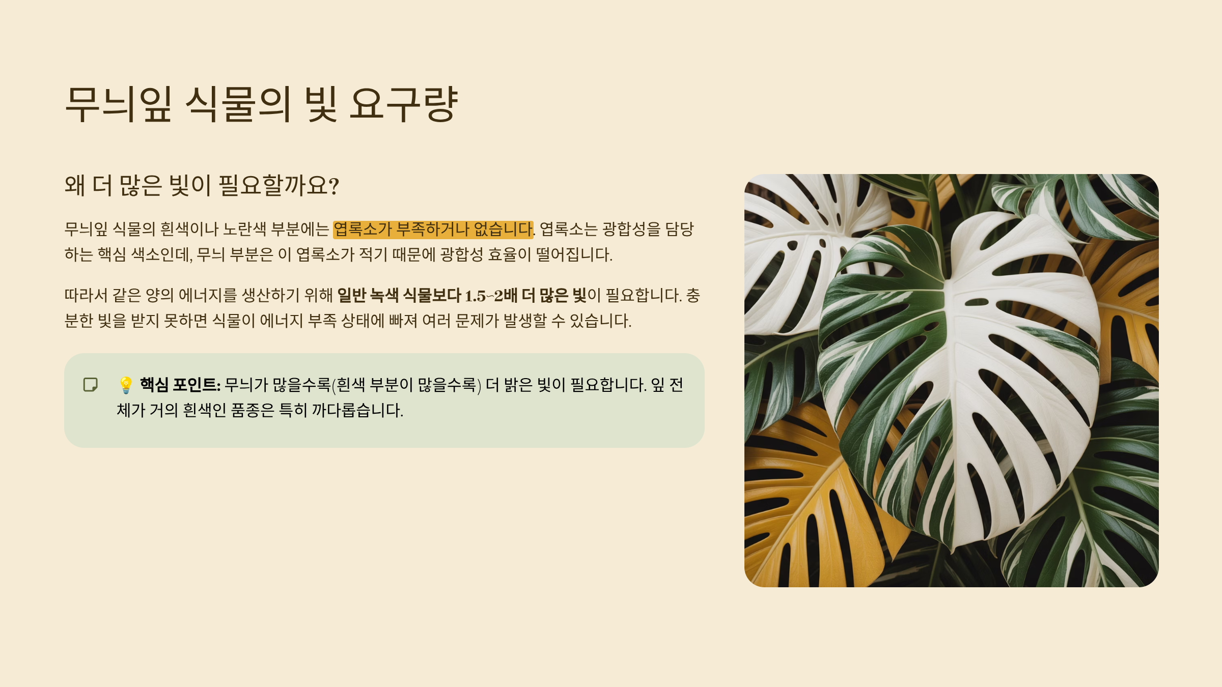 무늬잎 식물은 일반 초록잎 식물보다 상대적으로 빛을 더 많이 필요로 해요. 이유는 바로 광합성 효율이 낮기 때문이에요. 식물은 엽록소라는 초록색 색소로 빛을 받아 에너지를 만들어요. 그런데 무늬가 있는 부분은 엽록소가 거의 없거나 아예 없어요.