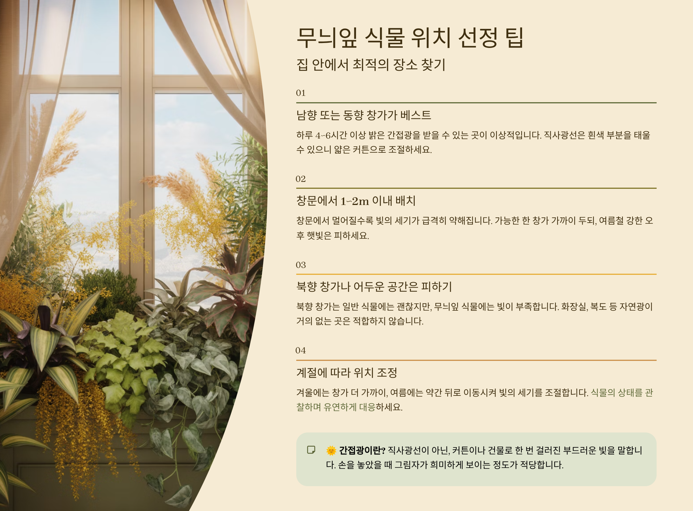 식물마다 빛 선호도가 조금씩 다르기 때문에 키우는 식물의 특성을 먼저 확인하고, 그에 맞는 자리를 찾아주는 게 가장 중요해요! 🌞