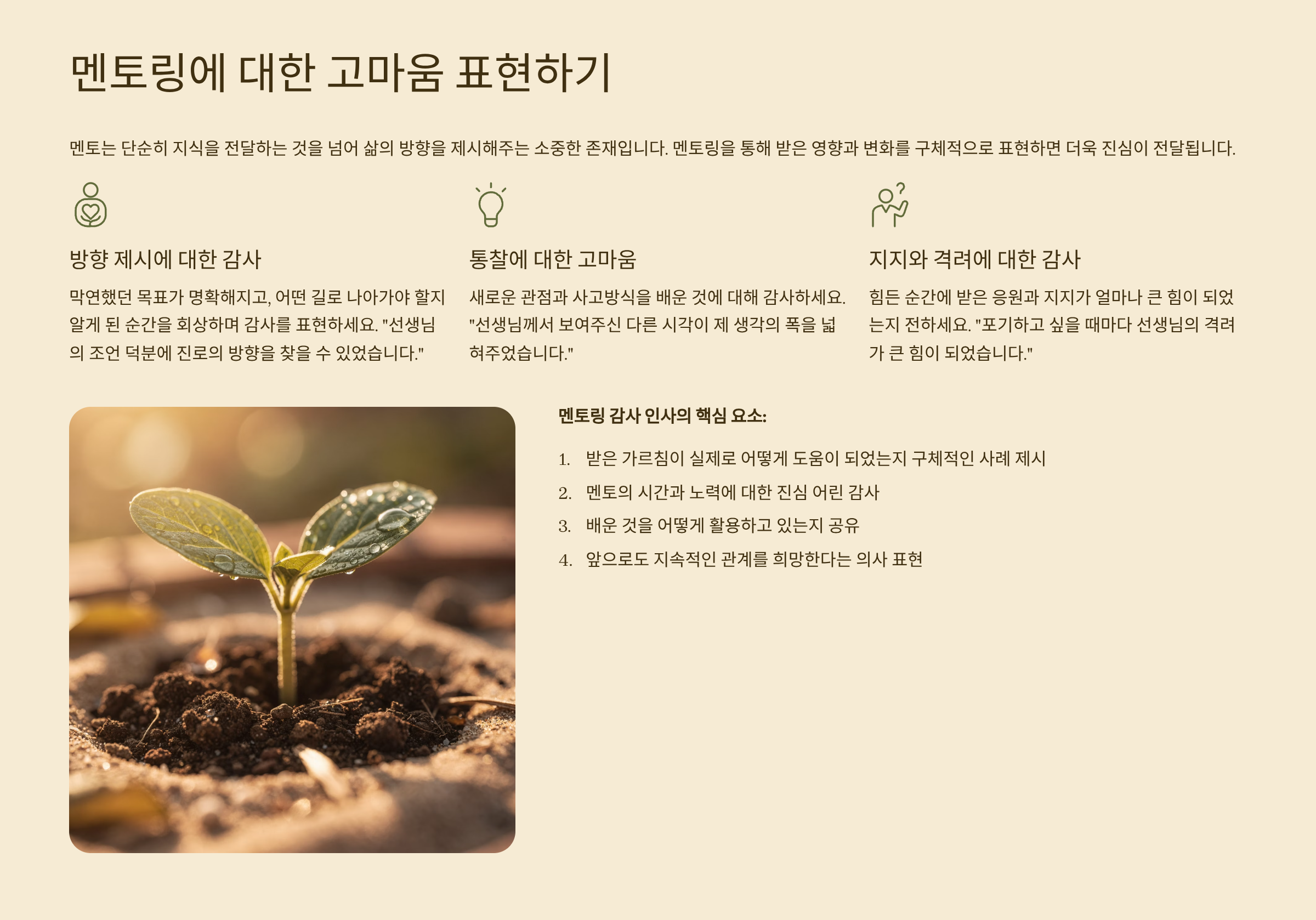 멘토님에게는 ‘배움’ 외에도 ‘인생 조언’, ‘경험 공유’에 대한 감사를 전하는 것이 좋아요. 단순히 지식을 넘어서 삶의 방향을 잡아주신 분들에게는 그 점을 강조해서 전하면 정말 감동적이에요.