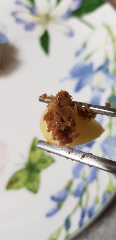 그때 아 쌈장이 생각이 나서 생마늘은 쌈장에 묻혀서 먹으니 알싸한 아린맛이 좀 중화되는 느낌이 들어 다시 생마늘크기에 따라 된장의 양을 조절하면서 먹어보니 바로 이거다 싶드라구요.