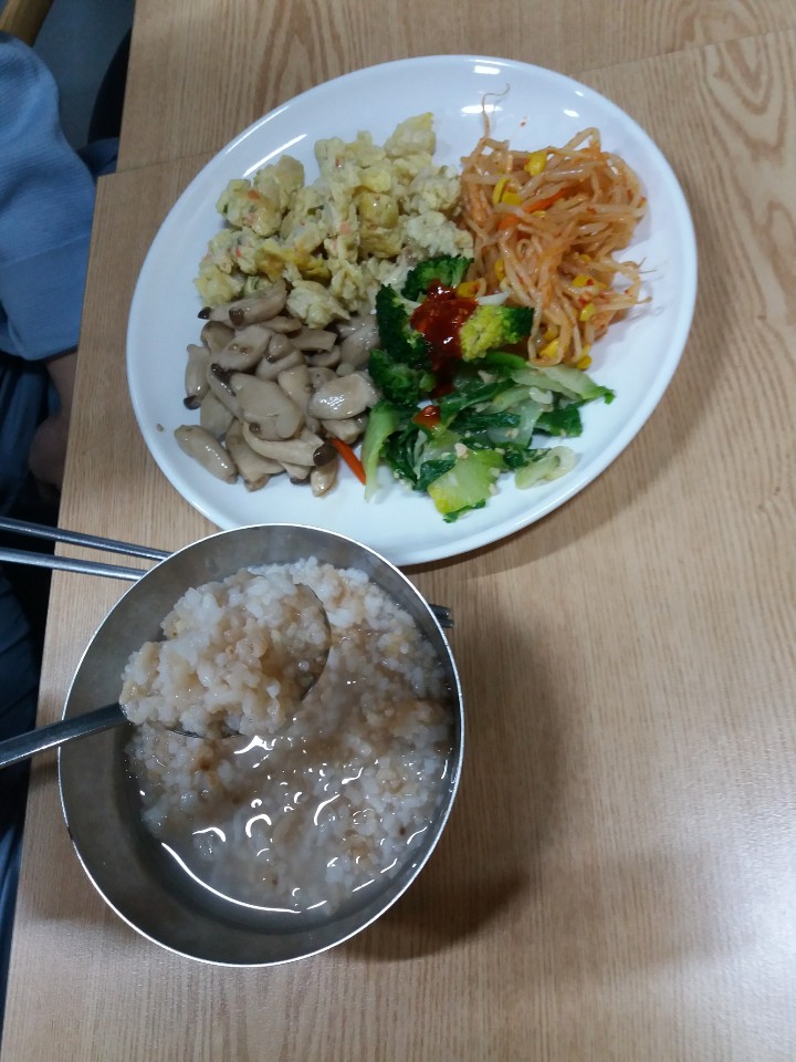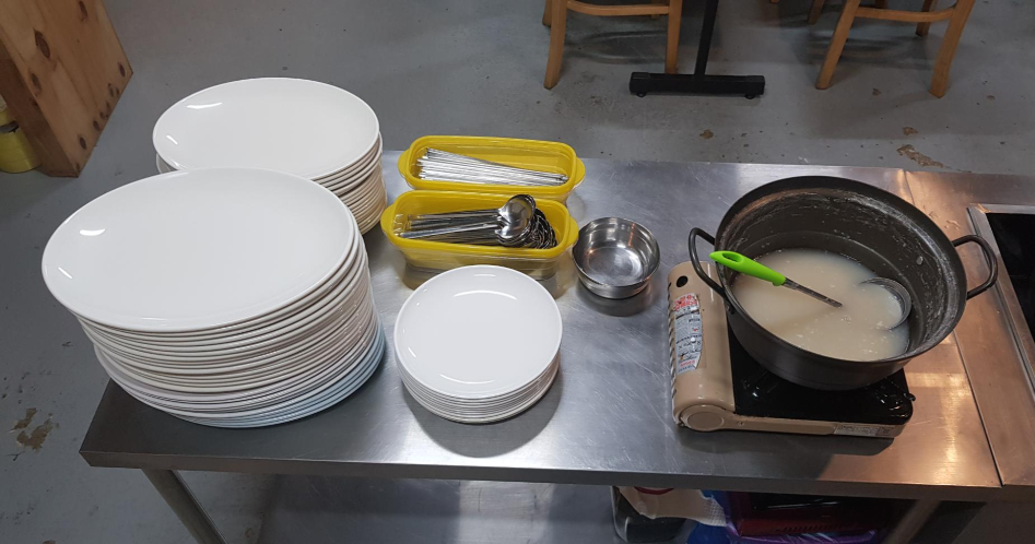 우리는 접시를 들고 맛난 점심을 먹기 위해 음식이 놓여 있는 곳에 접시에 하나둘씩 음식을 올리고 밥도 국도 가져와
