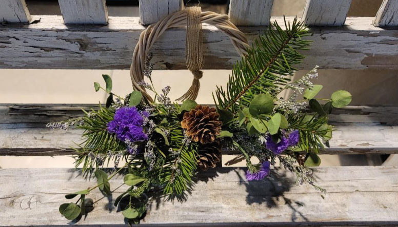 요번에 만들때는 약간 보랏빛이 보이는 스타치스라는 걸 사용하여 약간 분위기는 리스를 만들어 보니