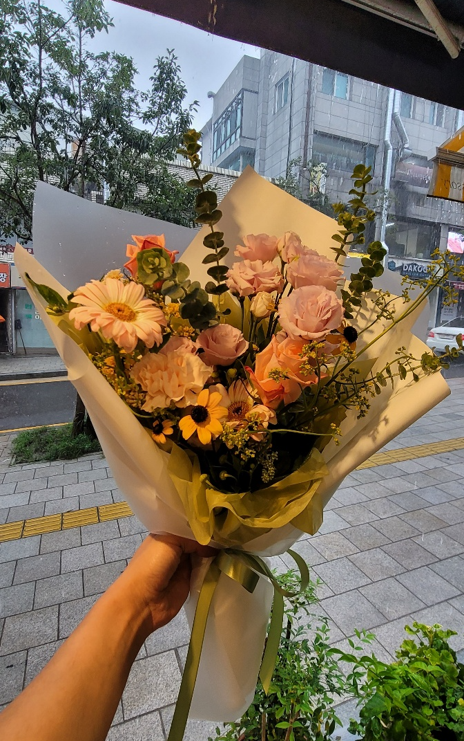 핑크 거베라 피치빛 장미 핑크빛 리시안 분위기가 한결