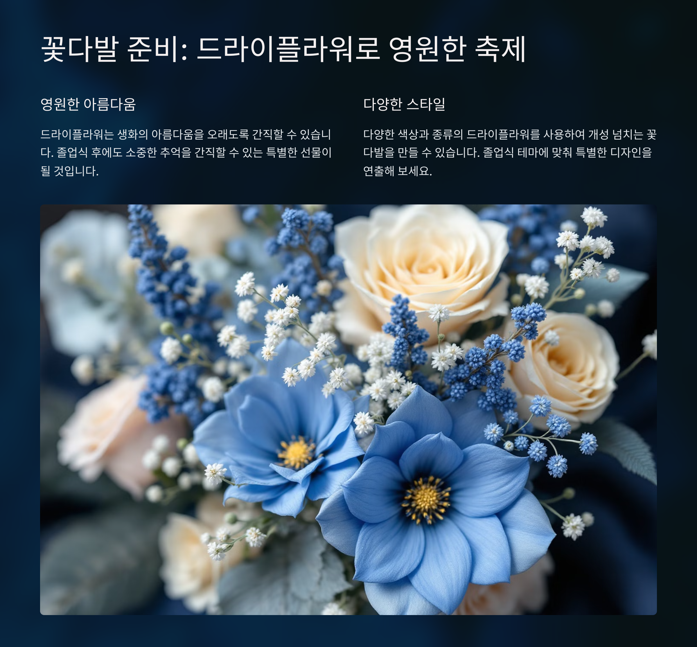 1. 드라이플라워: 드라이플라워는 오래 보관할 수 있어 졸업 이후에도 추억을 간직할 수 있는 아이템이에요. 다양한 컬러의 꽃을 조합하면 감각적인 분위기를 연출할 수 있답니다.