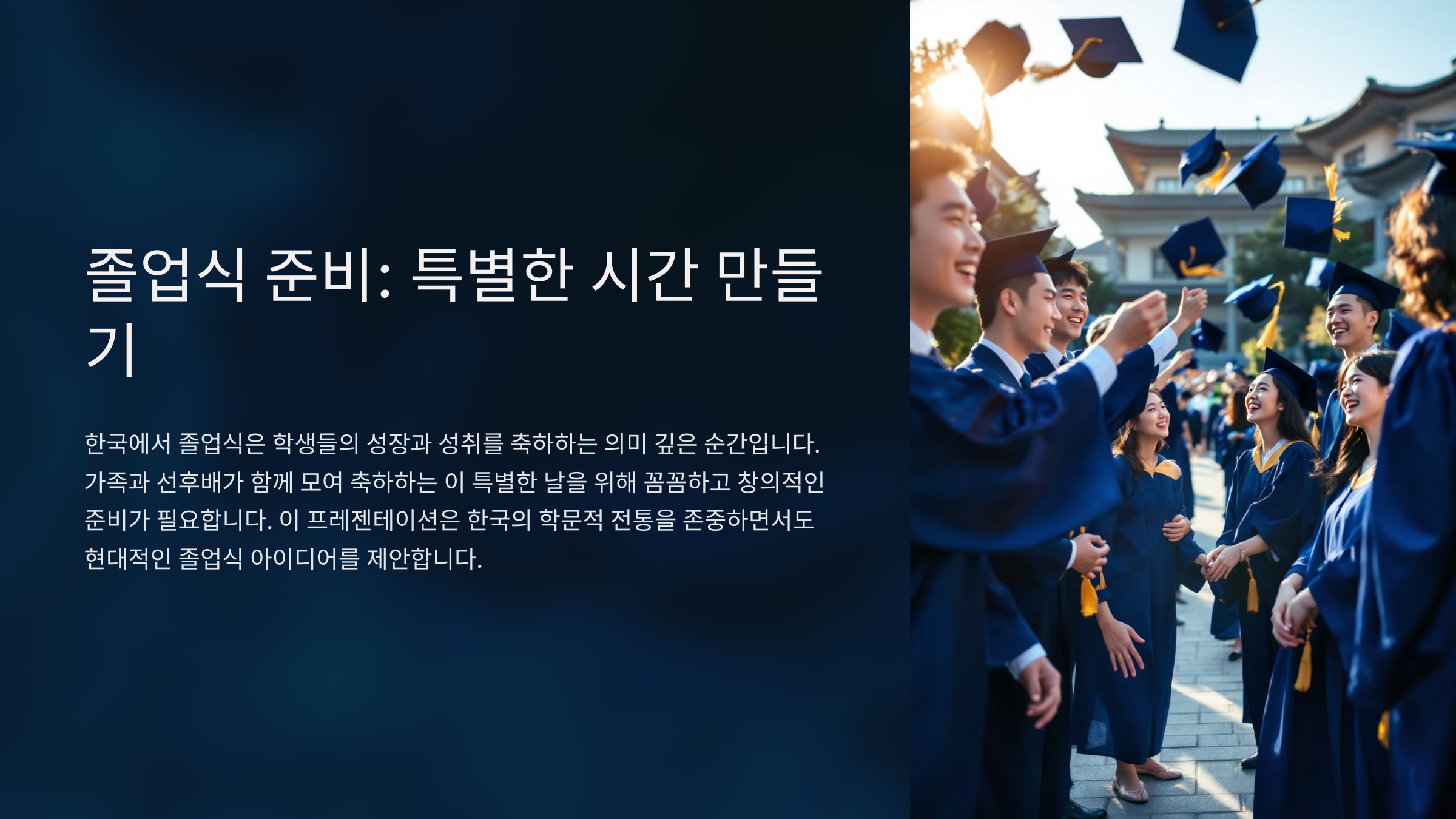졸업식의 특별한 순간을 사진으로 남길 때, 기존의 포즈와 구도에서 벗어나 독창적인 연출을 시도해보세요. 사진 속에서 졸업생의 개성과 특별함이 돋보일 거예요.
