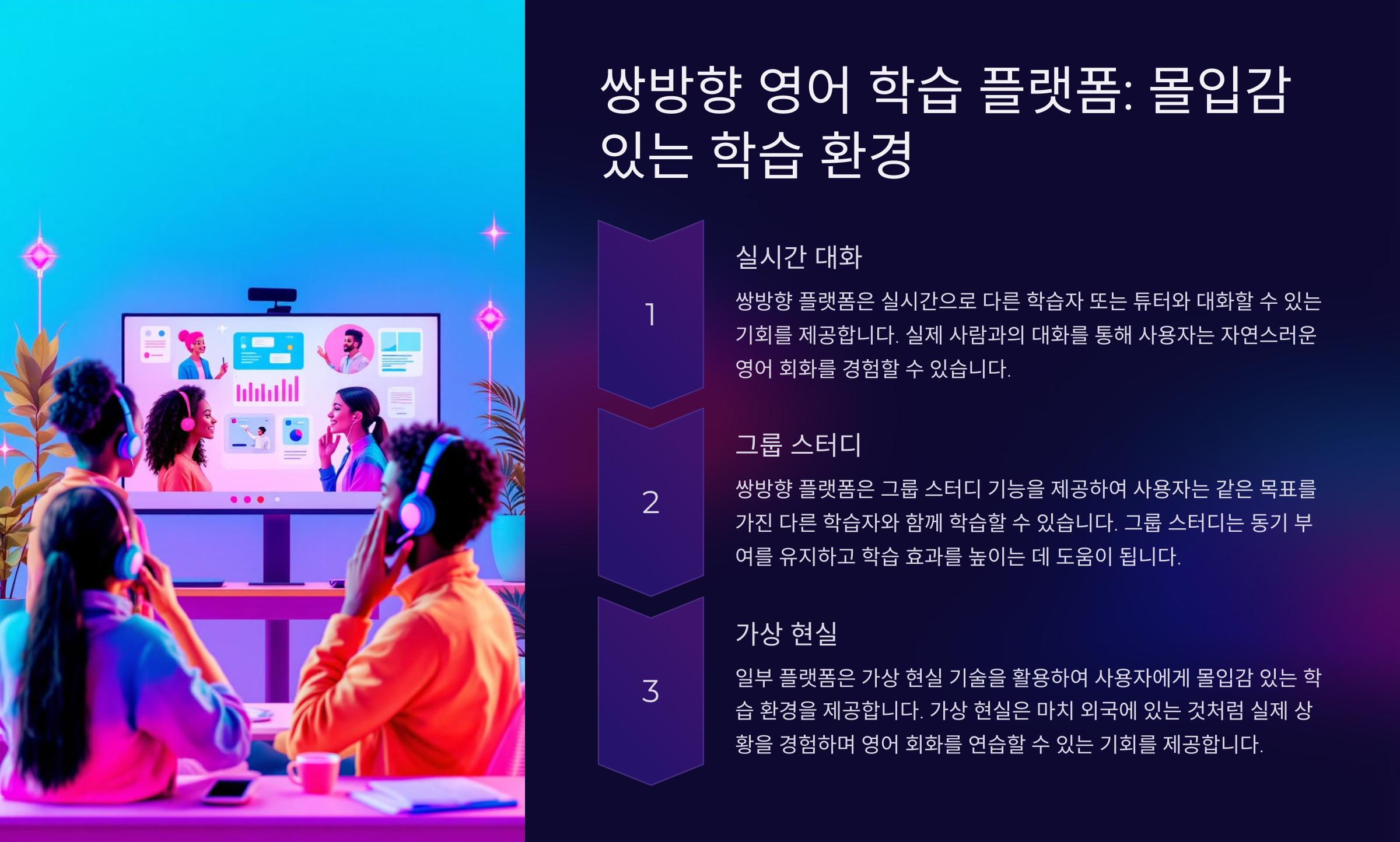 쌍방향 플랫폼의 가장 큰 장점은 학습자가 대화를 통해 실질적인 영어회화 능력을 키울 수 있다는 점이에요. 대화를 통해 학습자는 자신의 약점을 발견하고, 이를 보완해 나가며 더욱 자연스러운 영어 구사를 익힐 수 있답니다.