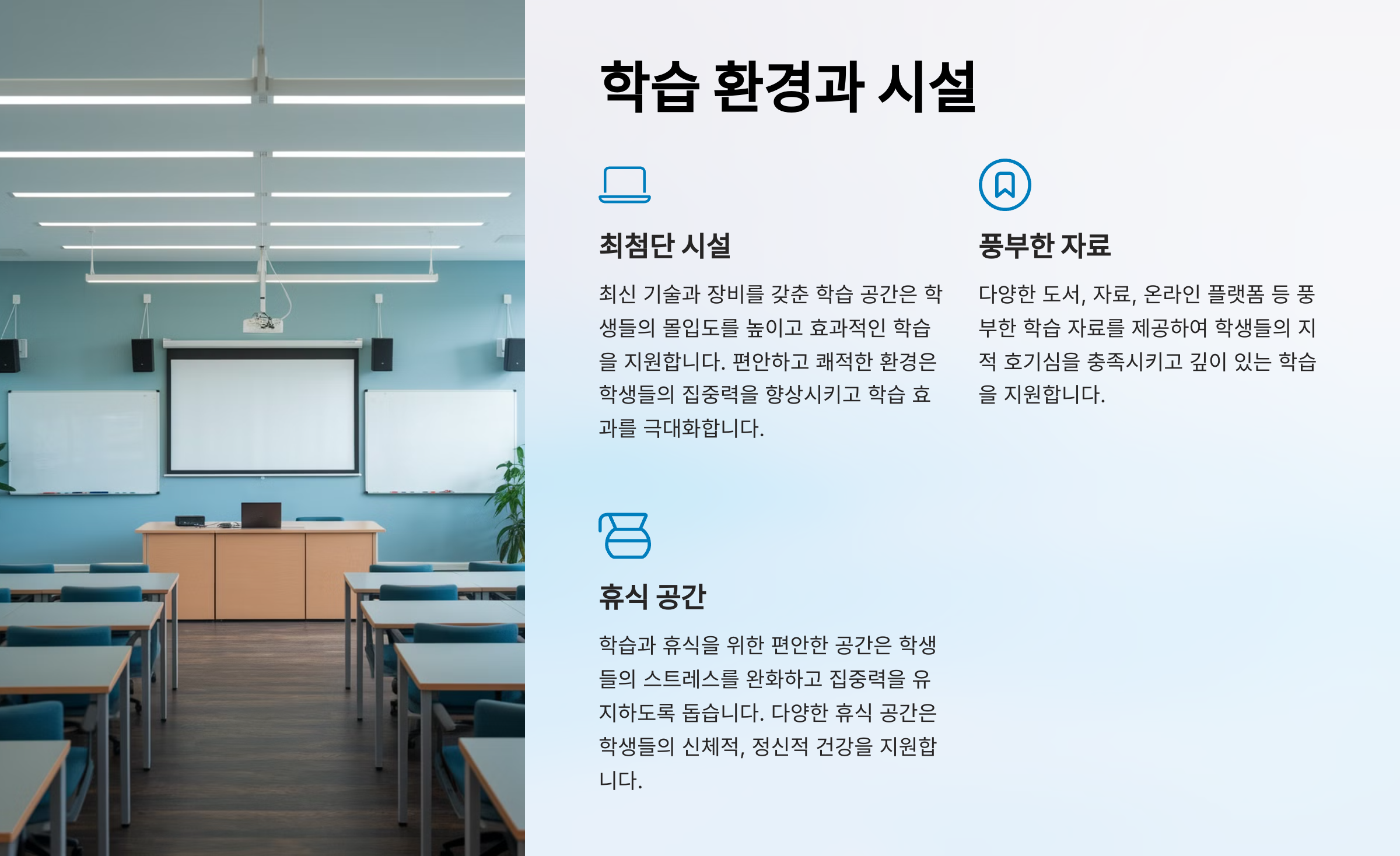 학습 환경은 학업의 효율성을 좌우하는 중요한 요소예요. 쾌적하고 깨끗한 학원 시설은 집중력을 높여주고, 학습에 몰입할