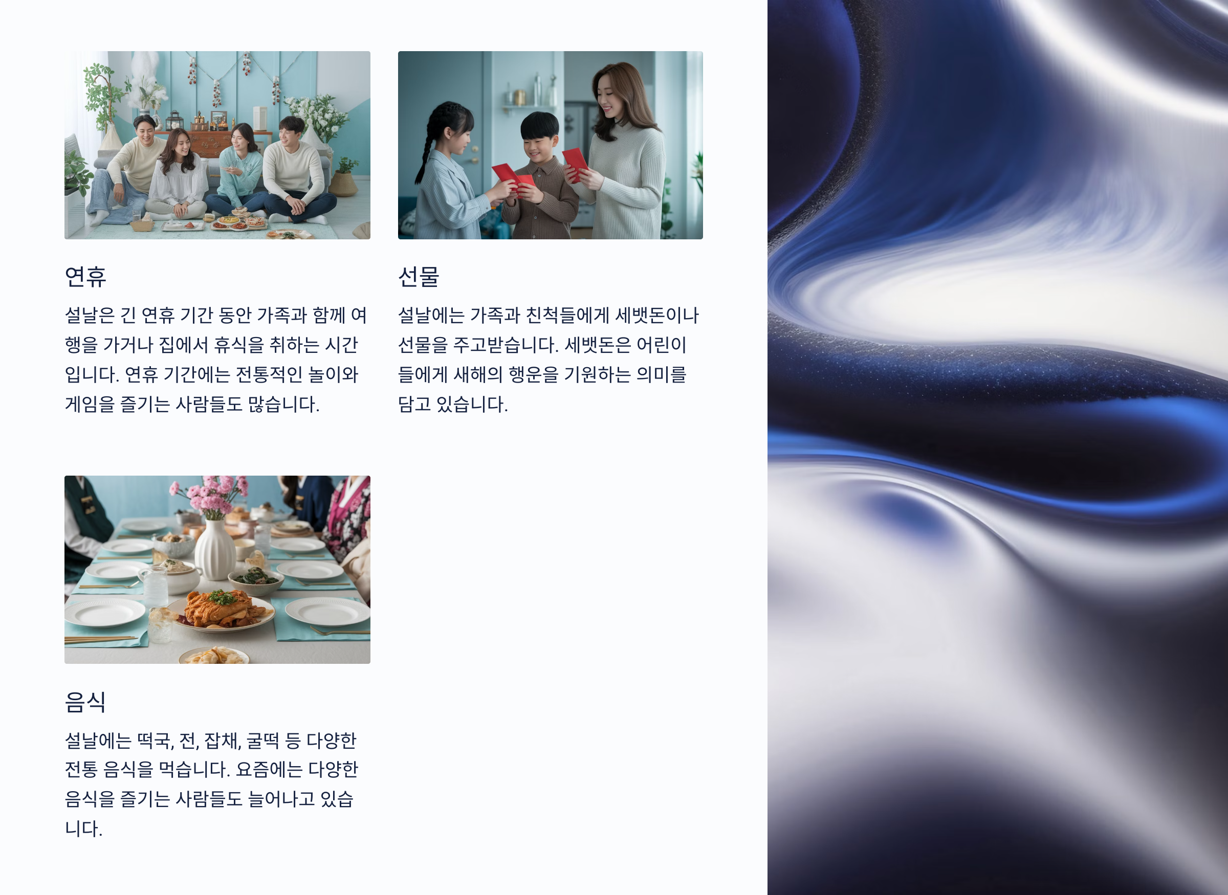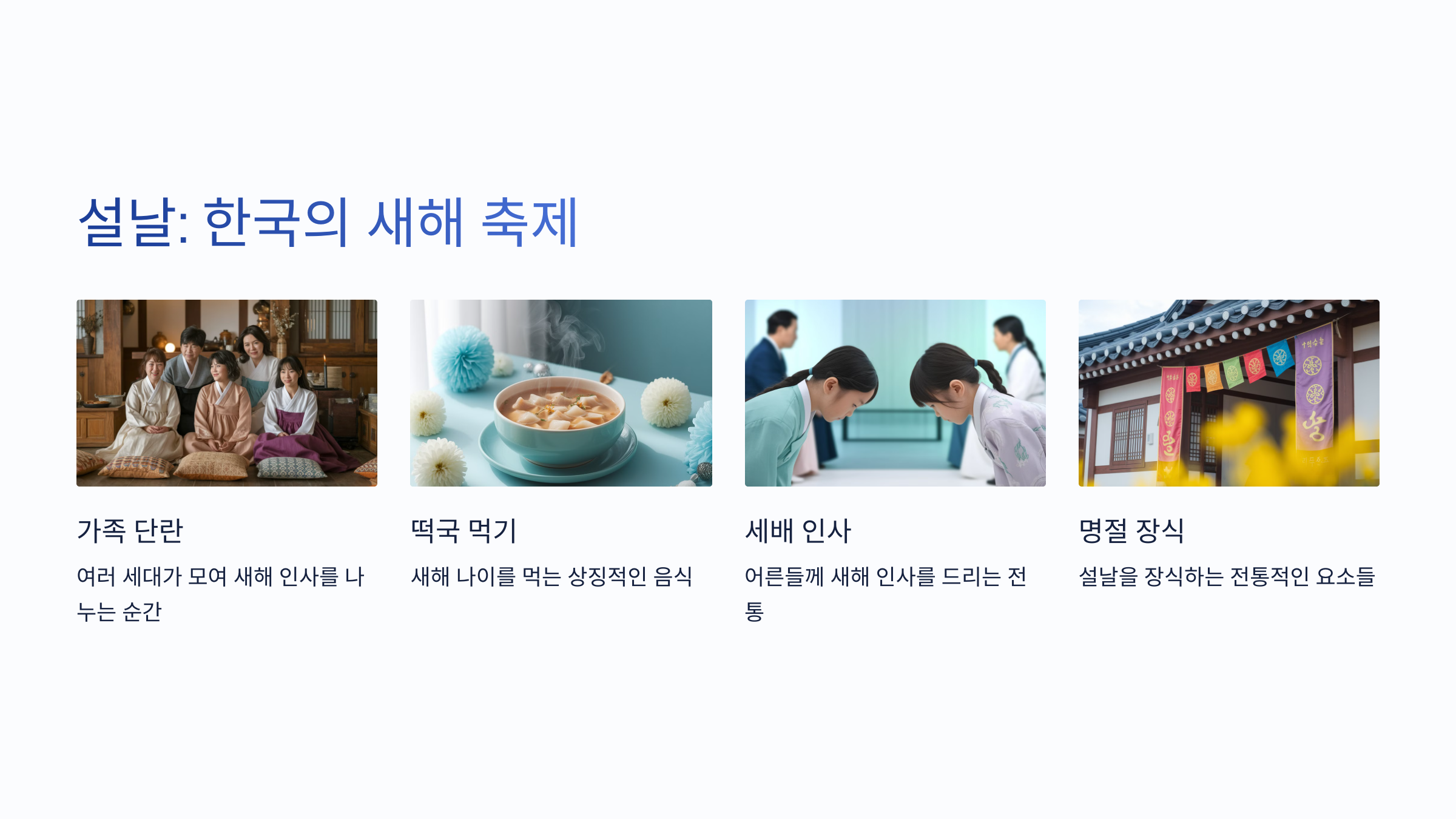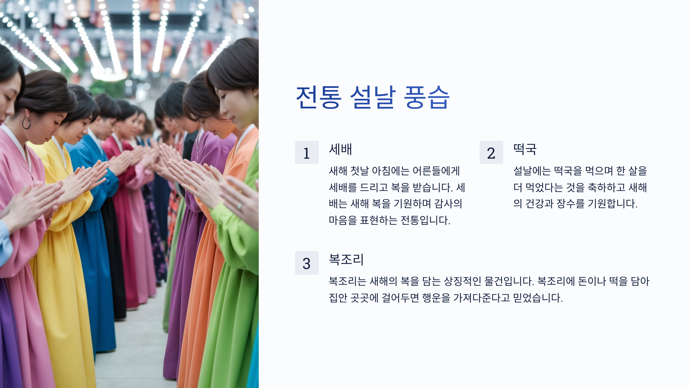 이처럼 설날은 과거에서부터 현재까지 이어지는 문화적 유산으로, 우리가 함께 지켜나가야 할 소중한 전통이에요.