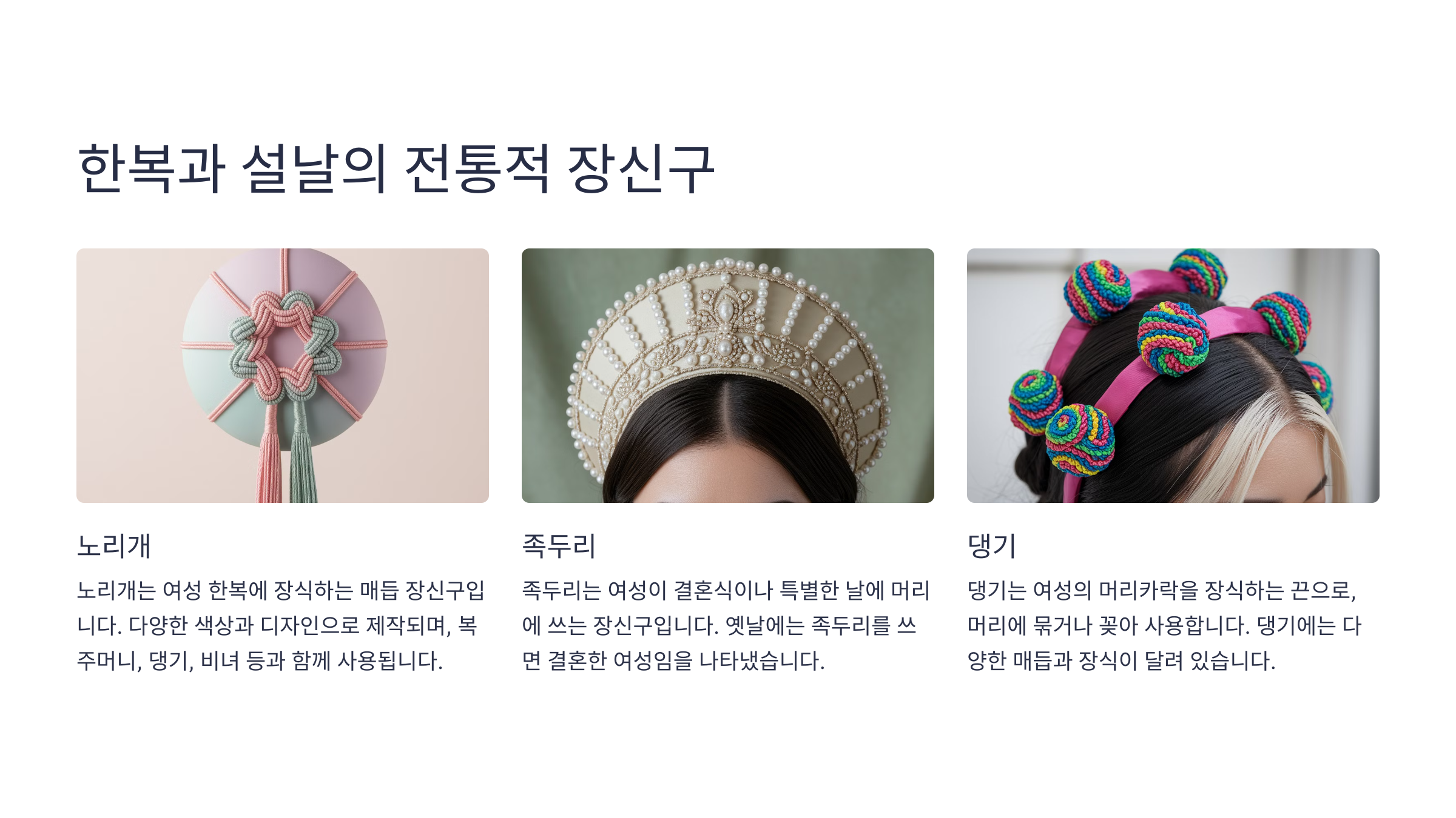 이처럼 한복과 함께 착용하는 전통 장신구는 설날의 특별한 의미를 더욱 돋보이게 만들며, 현대적인 디자인으로도 재해석돼 젊은 세대에게도 인기를 끌고 있어요.