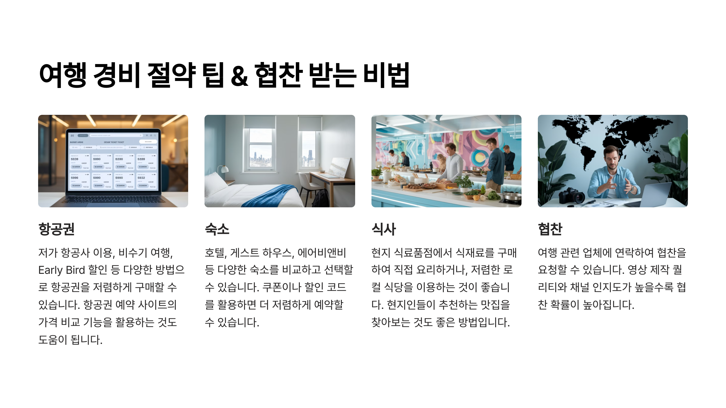 적은 비용으로도 효율적인 여행을 계획할 수 있어요. 협찬은 콘텐츠의 질을 높이면서 비용 부담을 줄이는 데 큰 도움이 돼요.