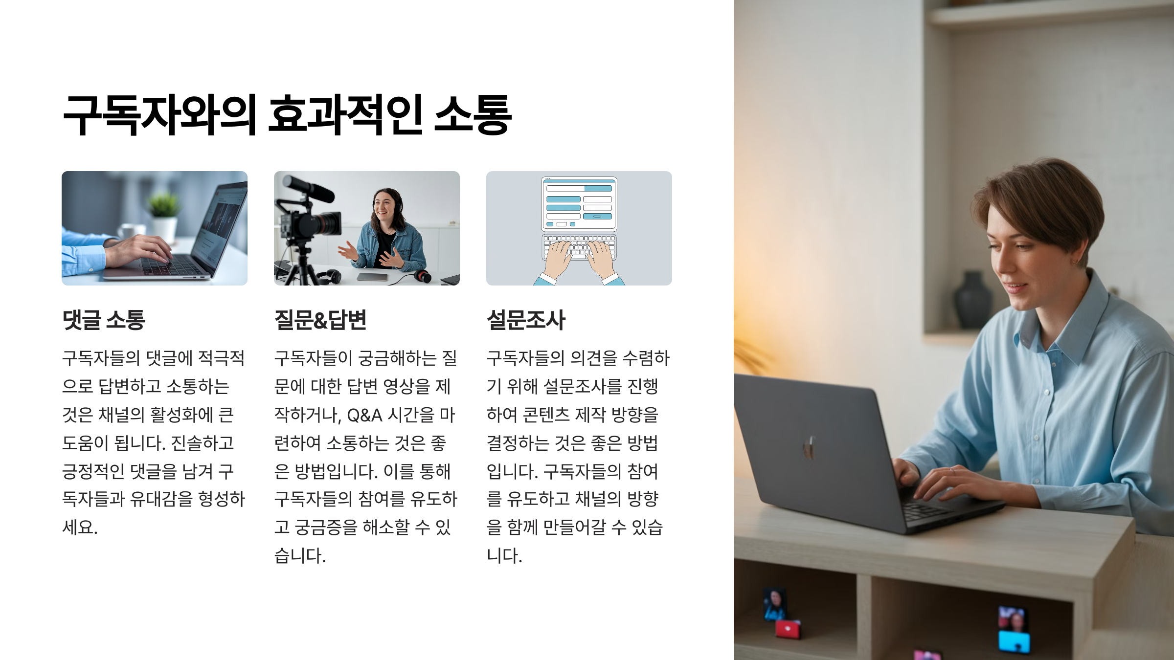 구독자와의 소통은 채널의 성장을 이끄는 중요한 요소예요. 아래는 효과적인 소통 방법이에요:
