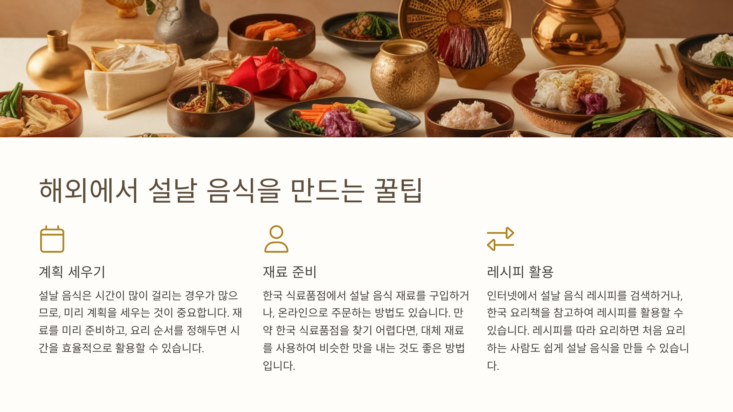 해외에서 설날 음식을 만들 때는 한국 재료를 구하기 어려운 경우가 많아요. 하지만 걱정하지 마세요! 몇 가지 대체 재료와 꿀팁을 활용하면 고향의 맛을 재현할 수 있답니다. 예를 들어, 떡국 떡이 없다면 얇게 썬 떡이나 쌀국수를 대체재로 사용할 수 있어요.