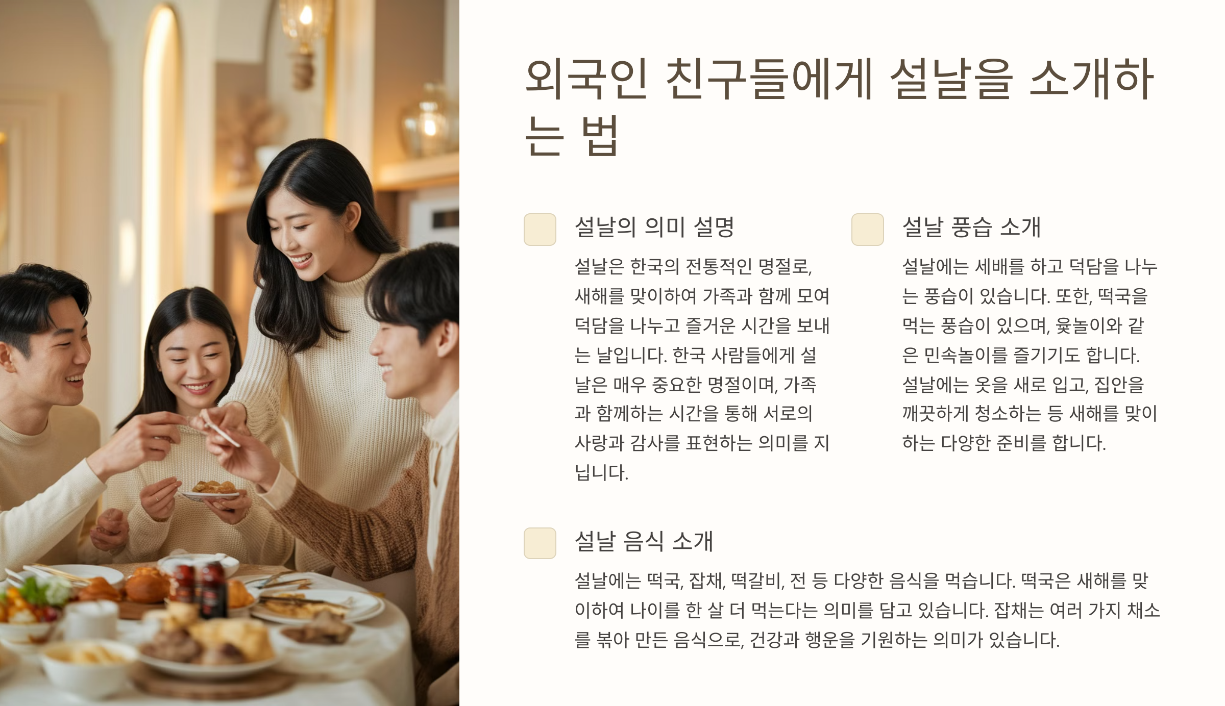 설명하는 거예요. 예를 들어, 설날의 유래, 차례와 세배의 의미를 소개하면 외국인 친구들이 한국 문화를 더 잘 이해할 수 있어요.