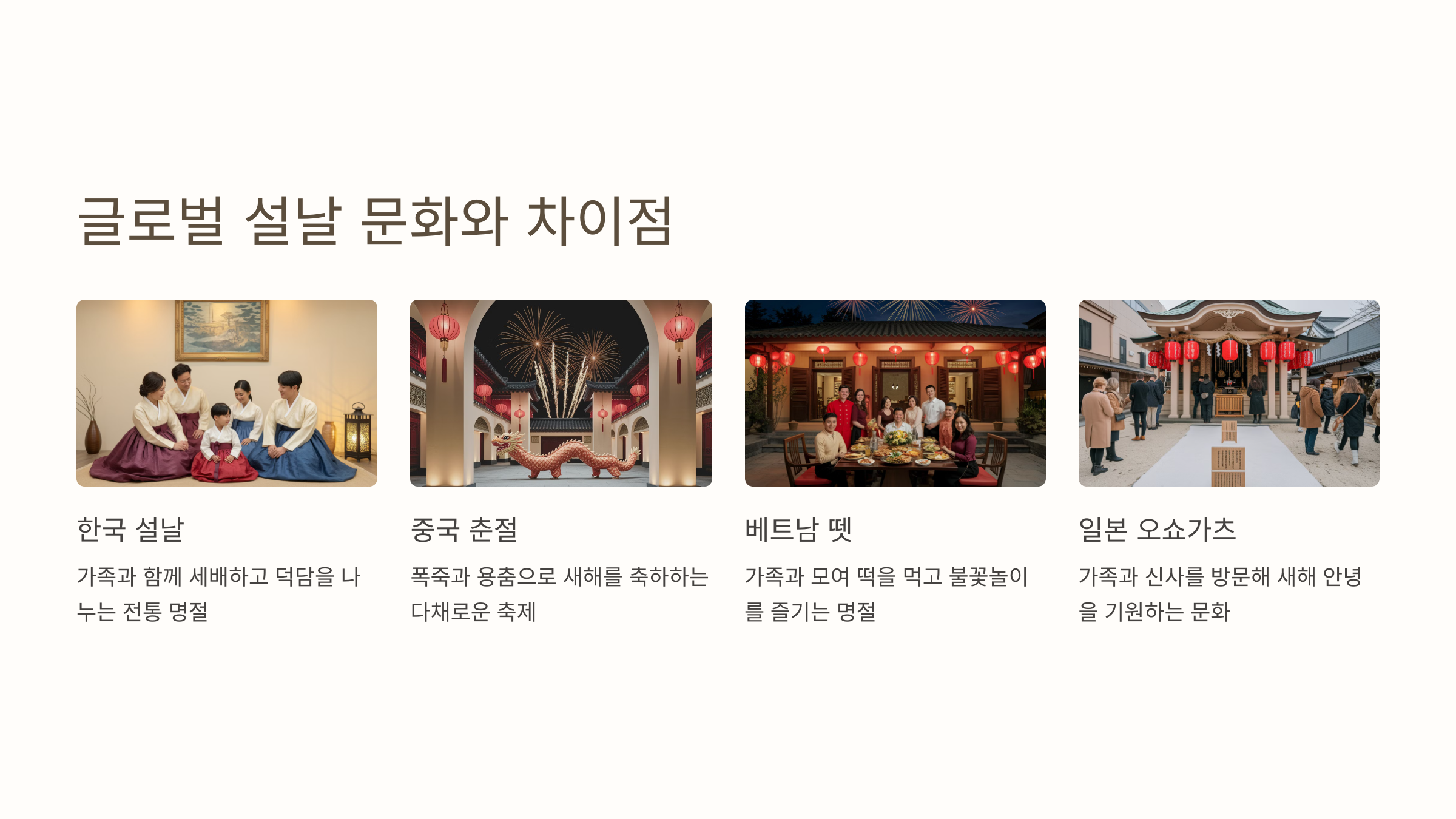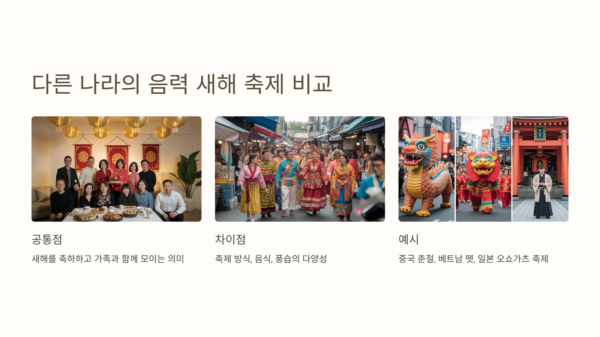 이처럼 다른 나라의 음력 새해 문화와 한국 설날을 비교해 보면 흥미로운 차이점과 공통점을 발견할 수 있어요. 이런 내용을 콘텐츠로 제작해보면 더욱 풍성한 스토리를 만들 수 있을 거예요.