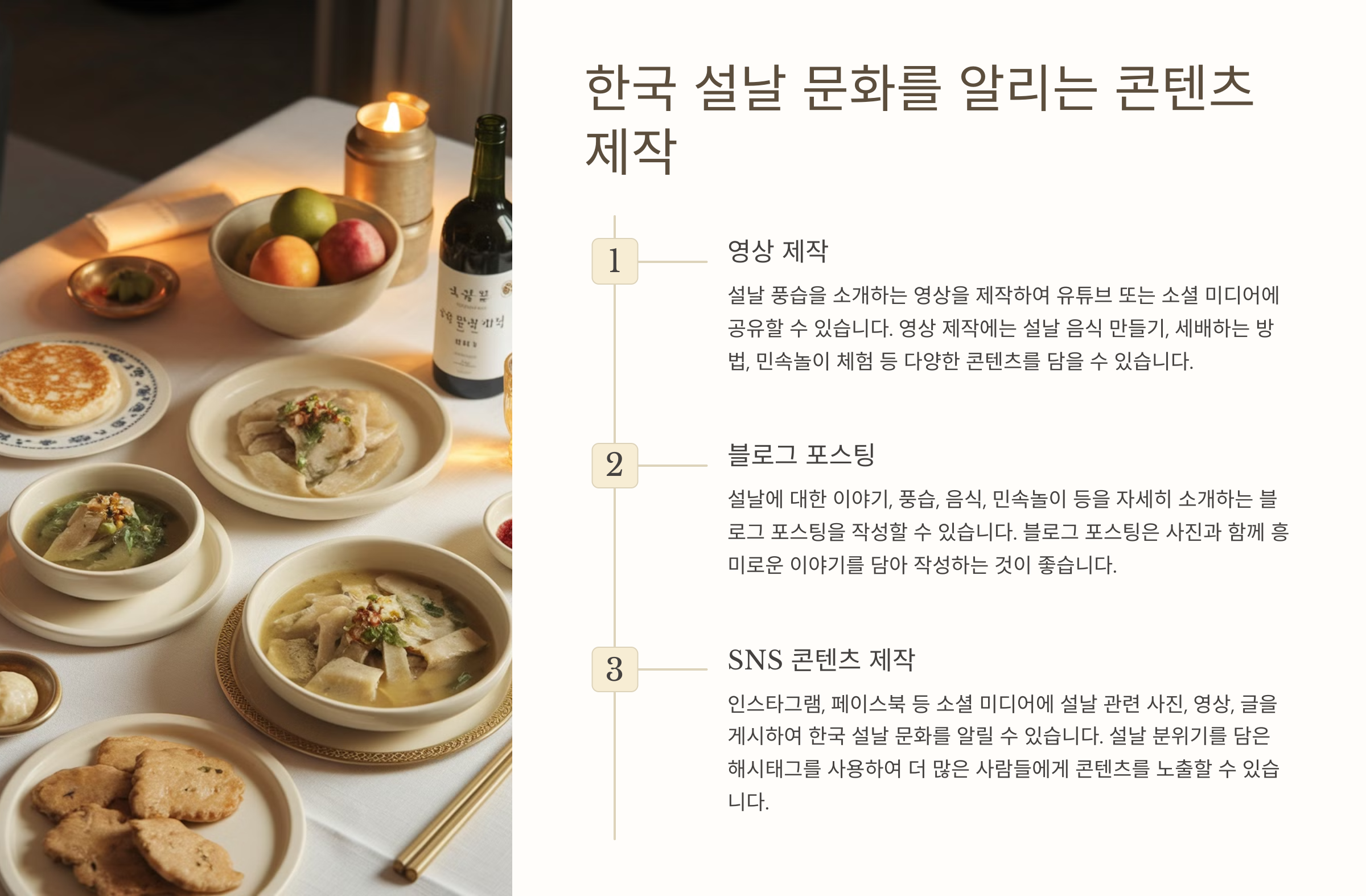 설날을 주제로 한 콘텐츠를 제작하면 한국 문화를 세계에 알릴 수 있는 멋진 기회가 돼요. 영상, 블로그, SNS 등 다양한 플랫폼에서 설날의 전통과 재미를 소개해보세요. 예를 들어, 차례 지내는 모습을 간단히 촬영하거나, 설날 음식을 만드는 과정을 담은 영상을 제작할 수 있어요.