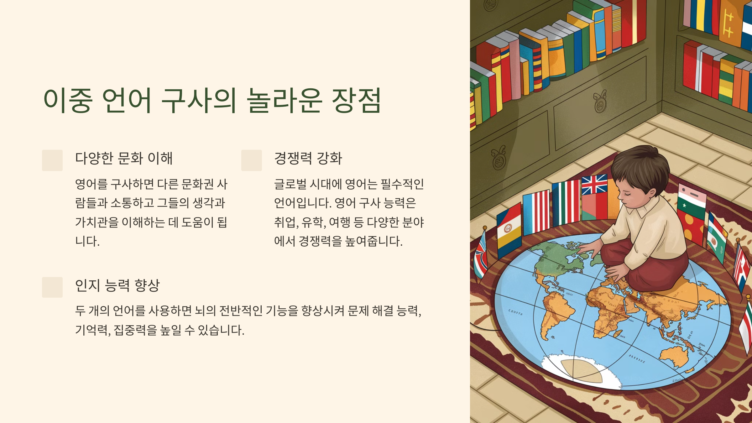 특히, 영어는 한국어와 발음과 문법 구조가 많이 달라요. 이런 차이를 극복하면서 아이들은 언어적 장벽을 깨고, 문제를 해결하는 방법을 배우게 돼요. 이 과정에서 얻는 자신감은 다른 학습과 성장에도 긍정적인 영향을 미친답니다.