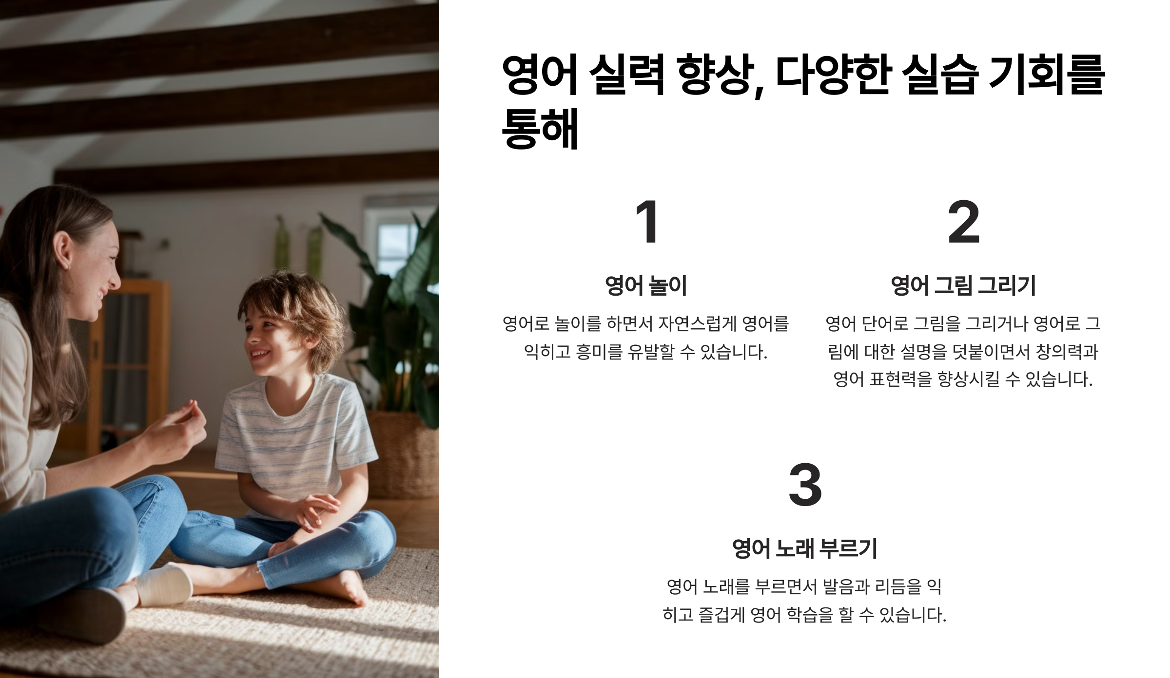 이런 영상 콘텐츠를 활용하면 아이들이 자연스럽게 영어에 익숙해질 수 있어요. 다음은 다양한 영어 실습 기회를 만들 수 있는 방법을 소개해 드릴게요!