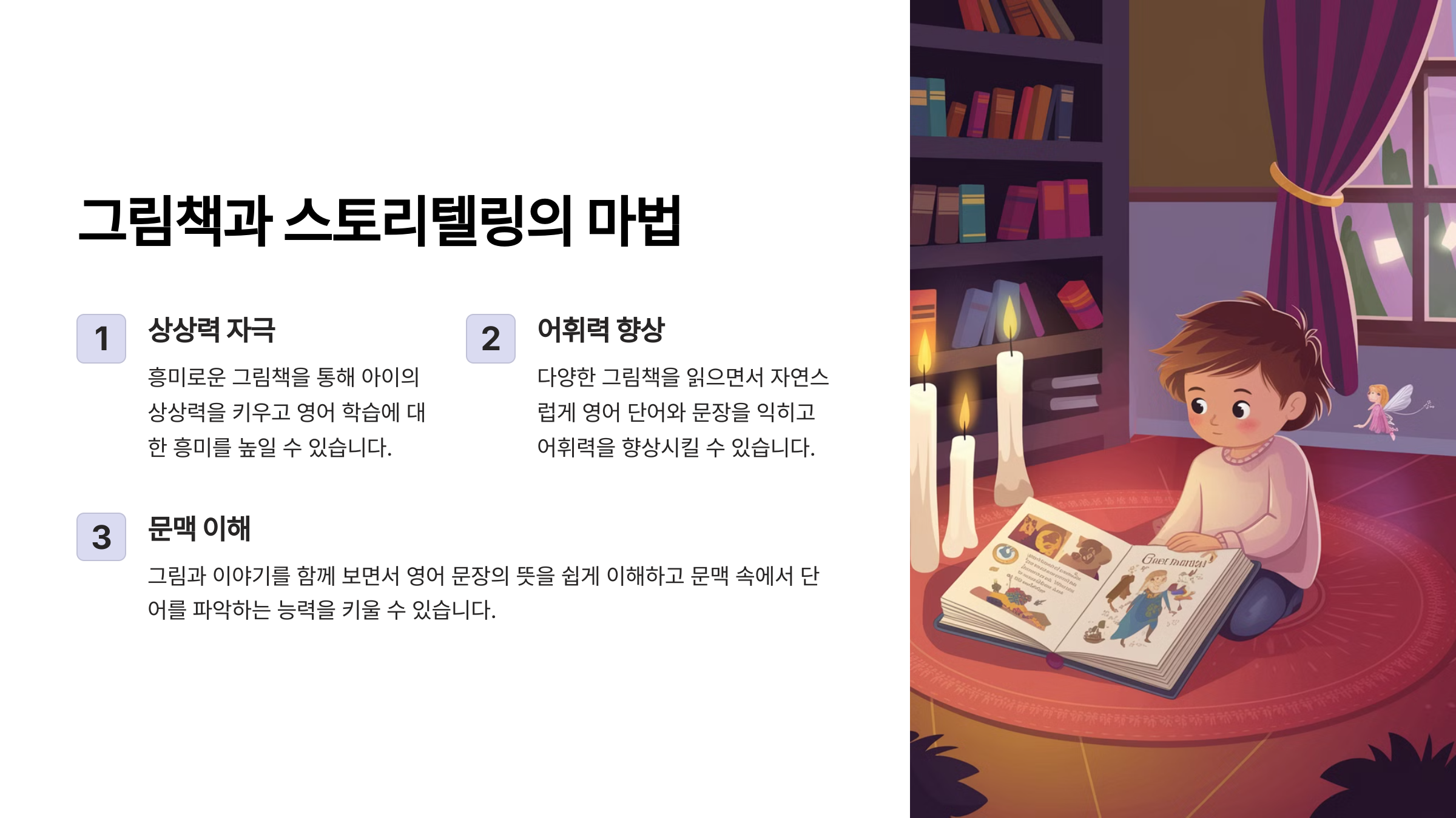 어린이들이 영어를 자연스럽게 익히도록 돕는 최고의 방법 중 하나가 바로 그림책과 스토리텔링이에요. 아이들은 이야기를 통해 언어를 배우는 데 익숙하기 때문에 그림책을 활용하면 쉽고 재미있게 영어를 접할 수 있어요.