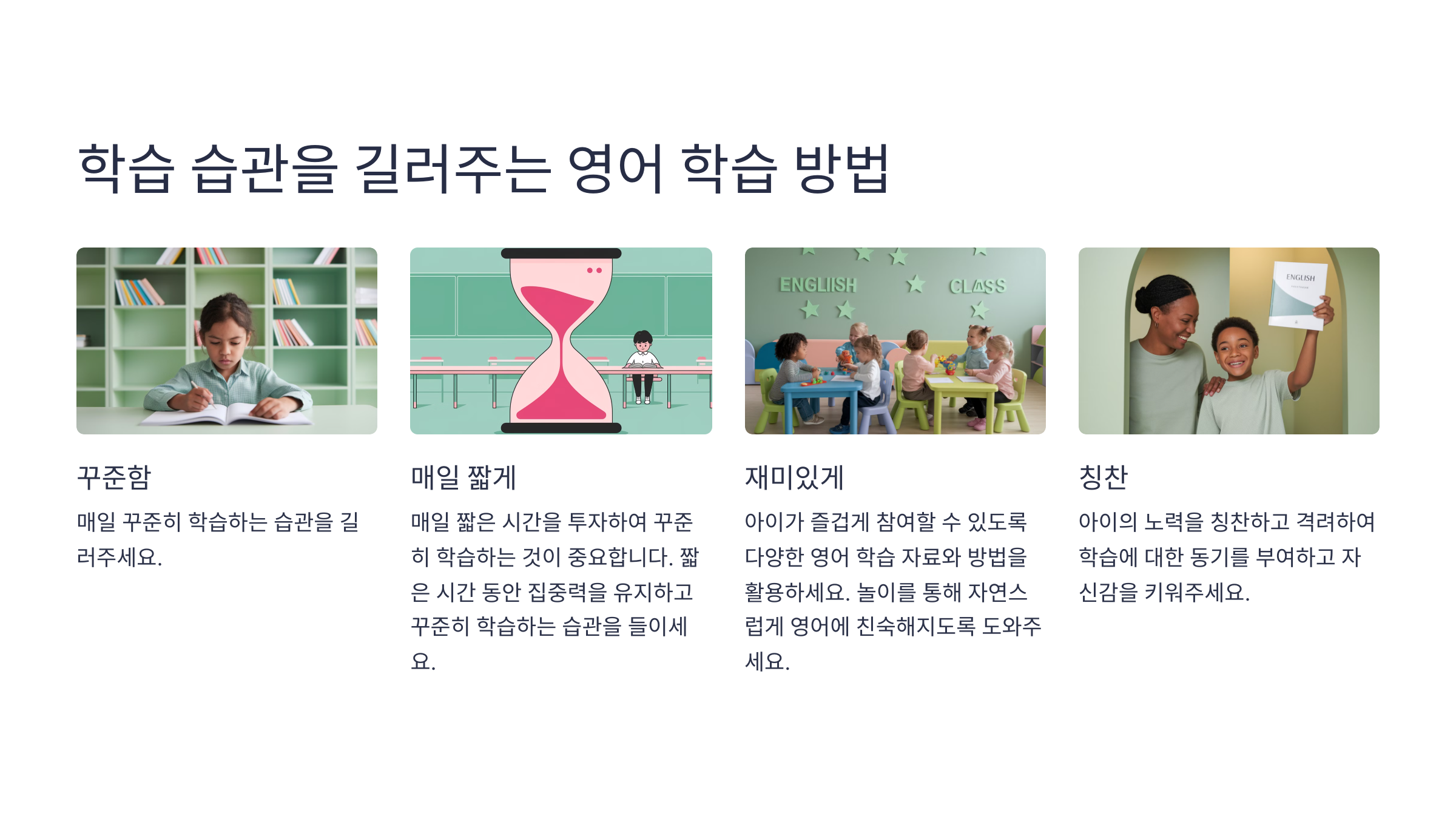 예를 들어, 매일 영어 그림책을 읽거나, 하루 한 곡씩 영어 노래를 따라 부르는 습관을 들이면 좋아요.