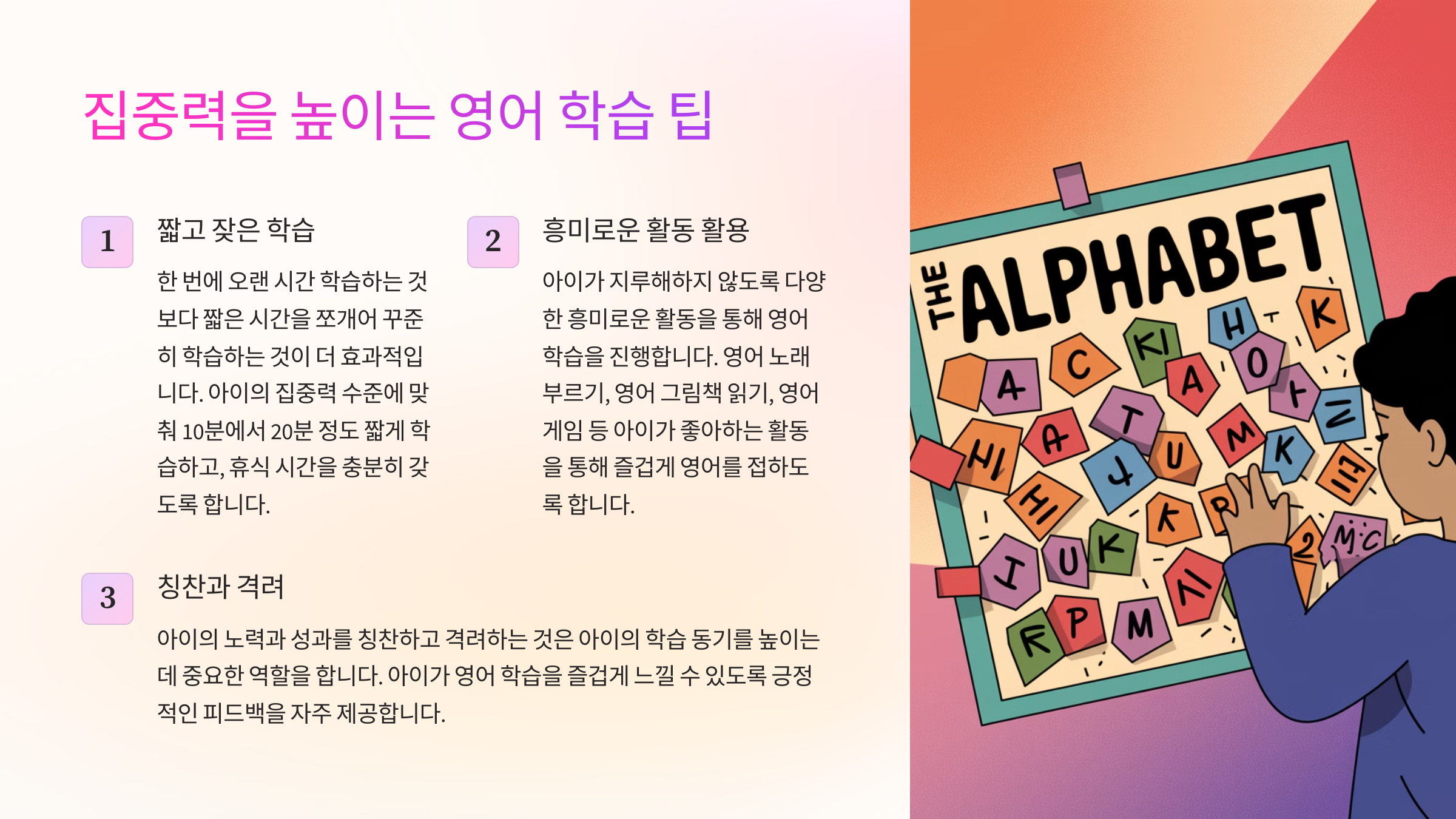 | 시각적 자료 활용 | 이미지와 함께 학습하면 이해도가 높아지고 집중력이 유지돼요. | "영어 단어 그림 카드", "애니메이션을 활용한 학습" |