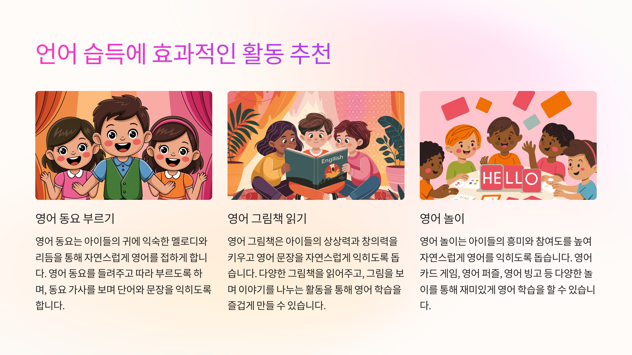 | 놀이 기반 학습 | 아이들이 즐겁게 참여할 수 있는 게임 형식으로 진행해요. | "단어 카드 게임", "영어 노래와 함께 춤추기" |