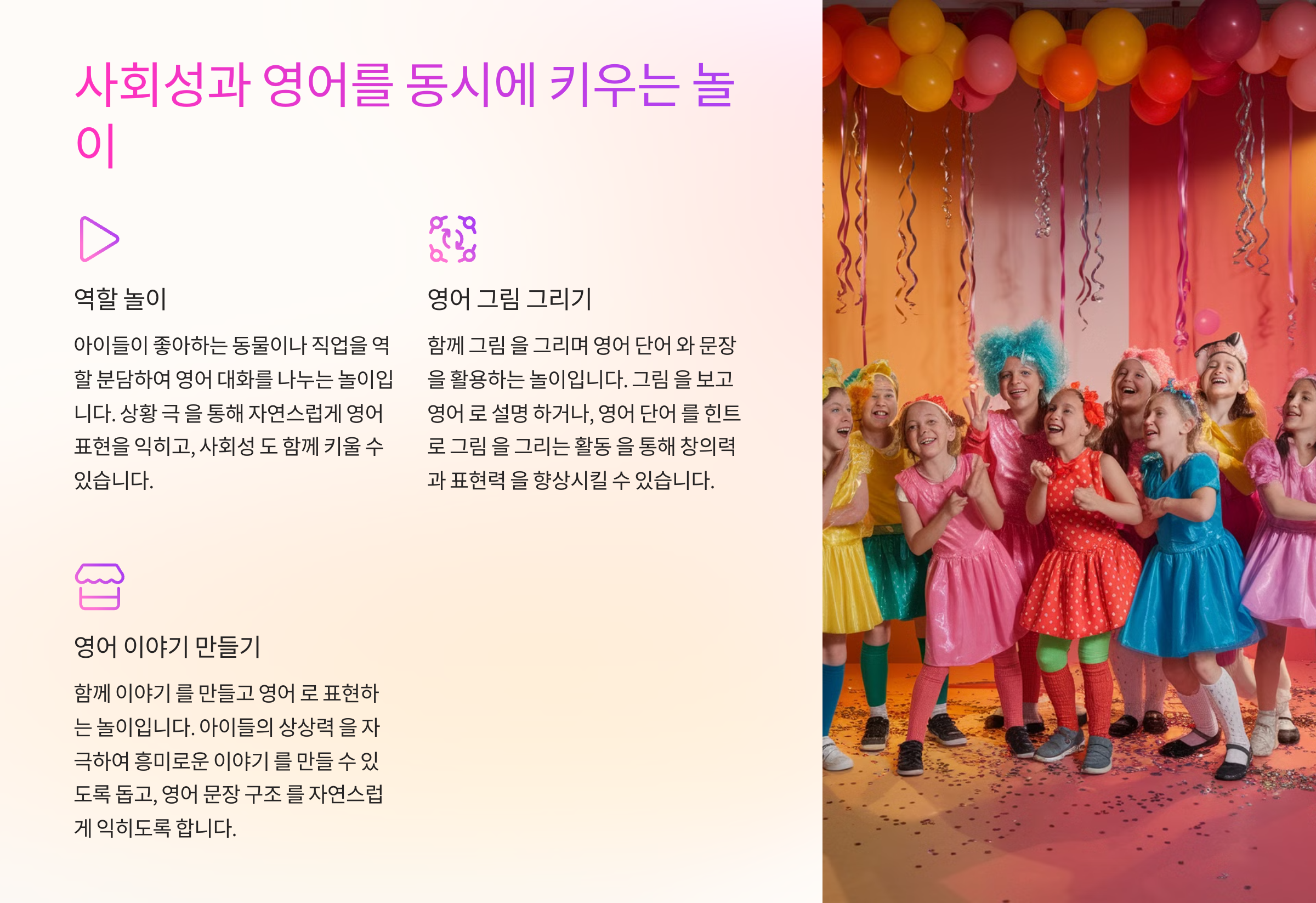 | 역할 놀이 | 상황을 설정하고 영어 대화를 연습할 수 있어요. | "슈퍼마켓 놀이", "의사 놀이" |