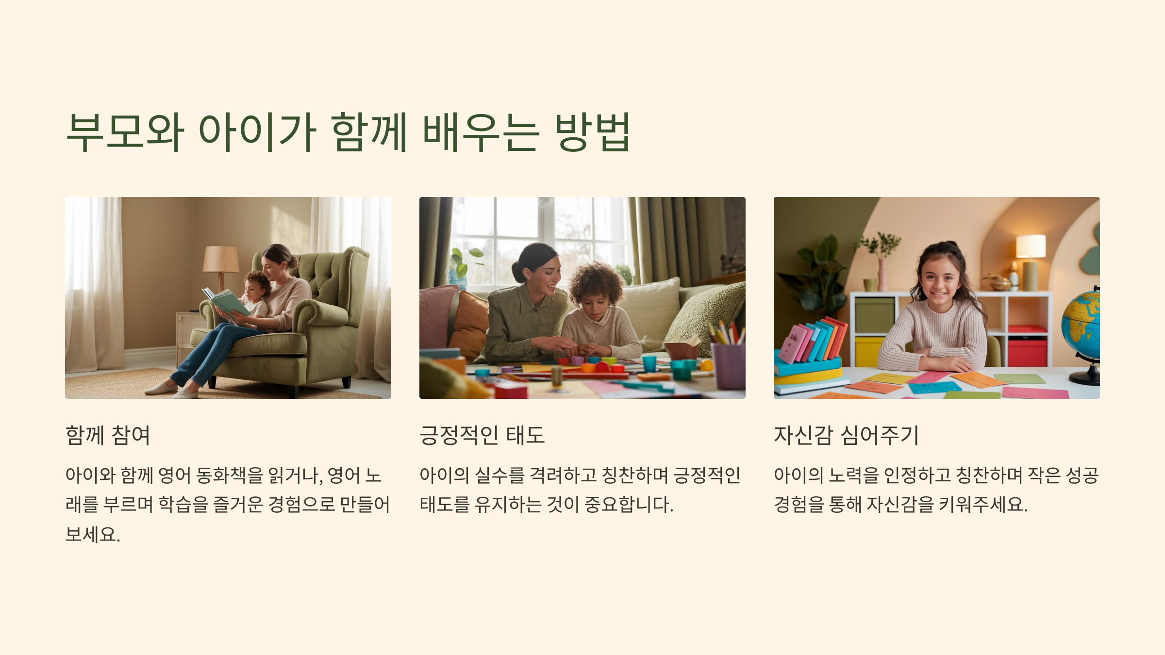 부모가 아이와 함께 영어를 배우면 아이도 더욱 즐겁게 학습할 수 있어요. 영어를 모국어처럼 익히는 것이 아니라, 놀이하듯이 자연스럽게 배울 수 있도록 도와주는 것이 중요하답니다.