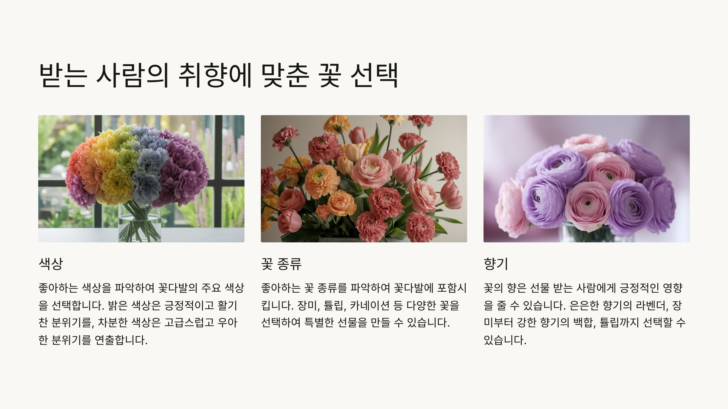 예를 들어, 화려한 것을 좋아하는 사람에게는 장미나 백합처럼 크고 존재감 있는 꽃이 좋아요. 반면에, 자연스러운 분위기를 선호하는 사람에게는 튤립, 프리지아, 라넌큘러스 같은 부드러운 느낌의 꽃이 잘 어울려요.