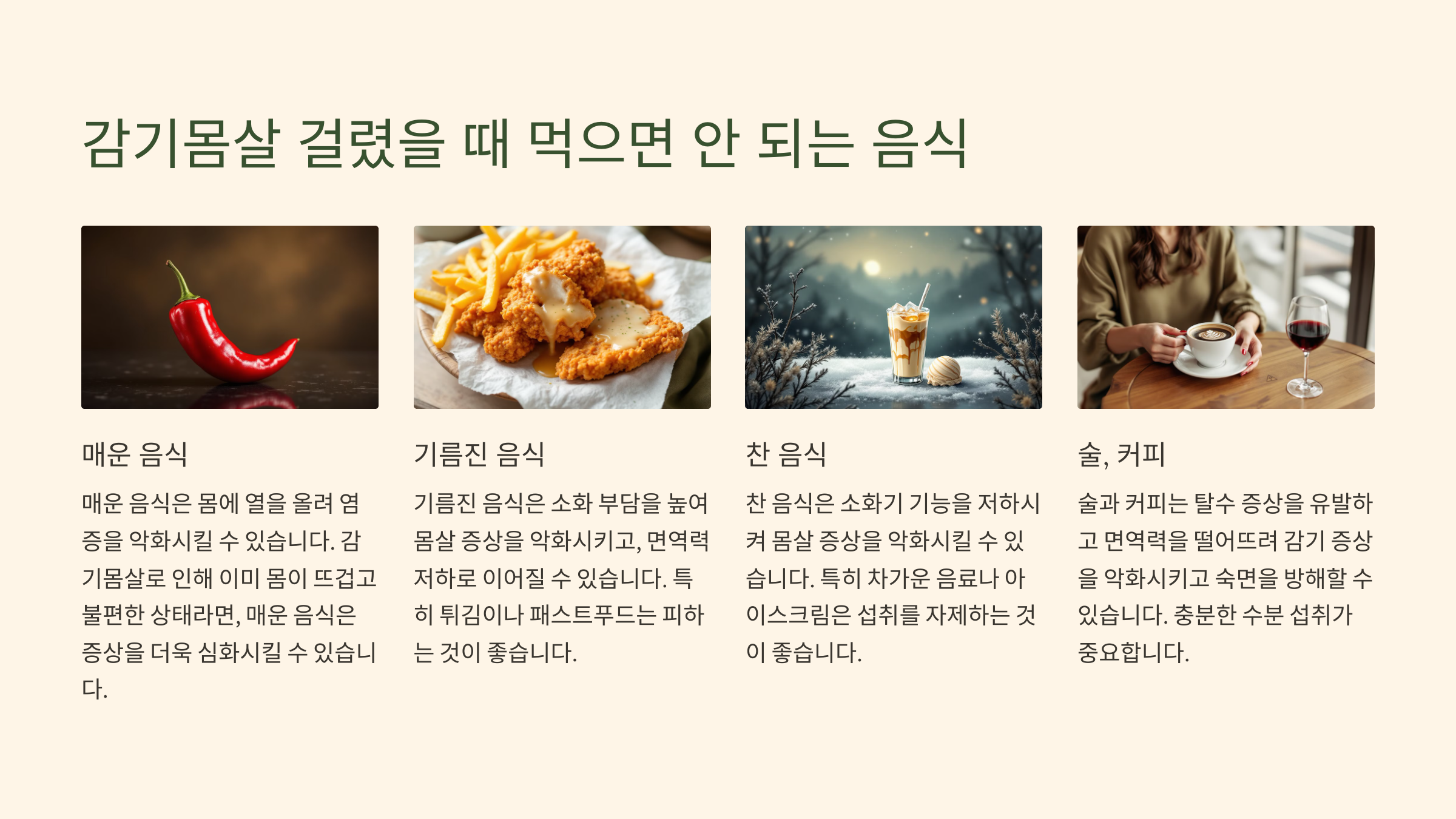 감기몸살이 걸리면 면역력이 약해져서 음식 선택이 더욱 중요해요. 평소에 잘 먹던 음식이라도 감기몸살일 때는 독이 될 수 있어요. 어떤 음식이 감기몸살을 악화시키는지 확인해볼까요? 🤔