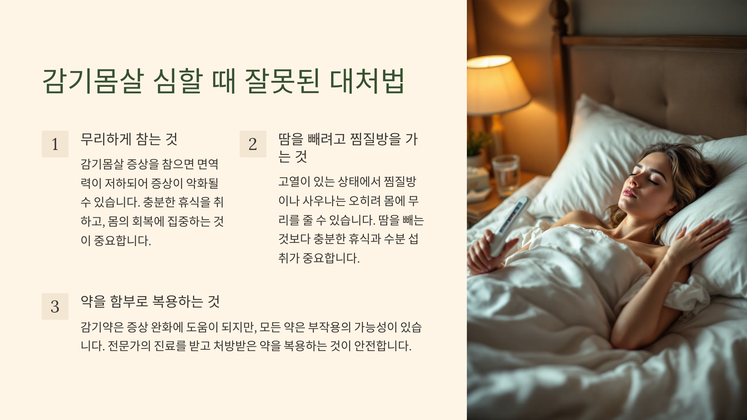 감기몸살이 심할 때 우리는 종종 잘못된 방법으로 대처할 때가 있어요. 이런 행동들은 오히려 증상을 악화시키거나 회복을 늦출 수 있어요.