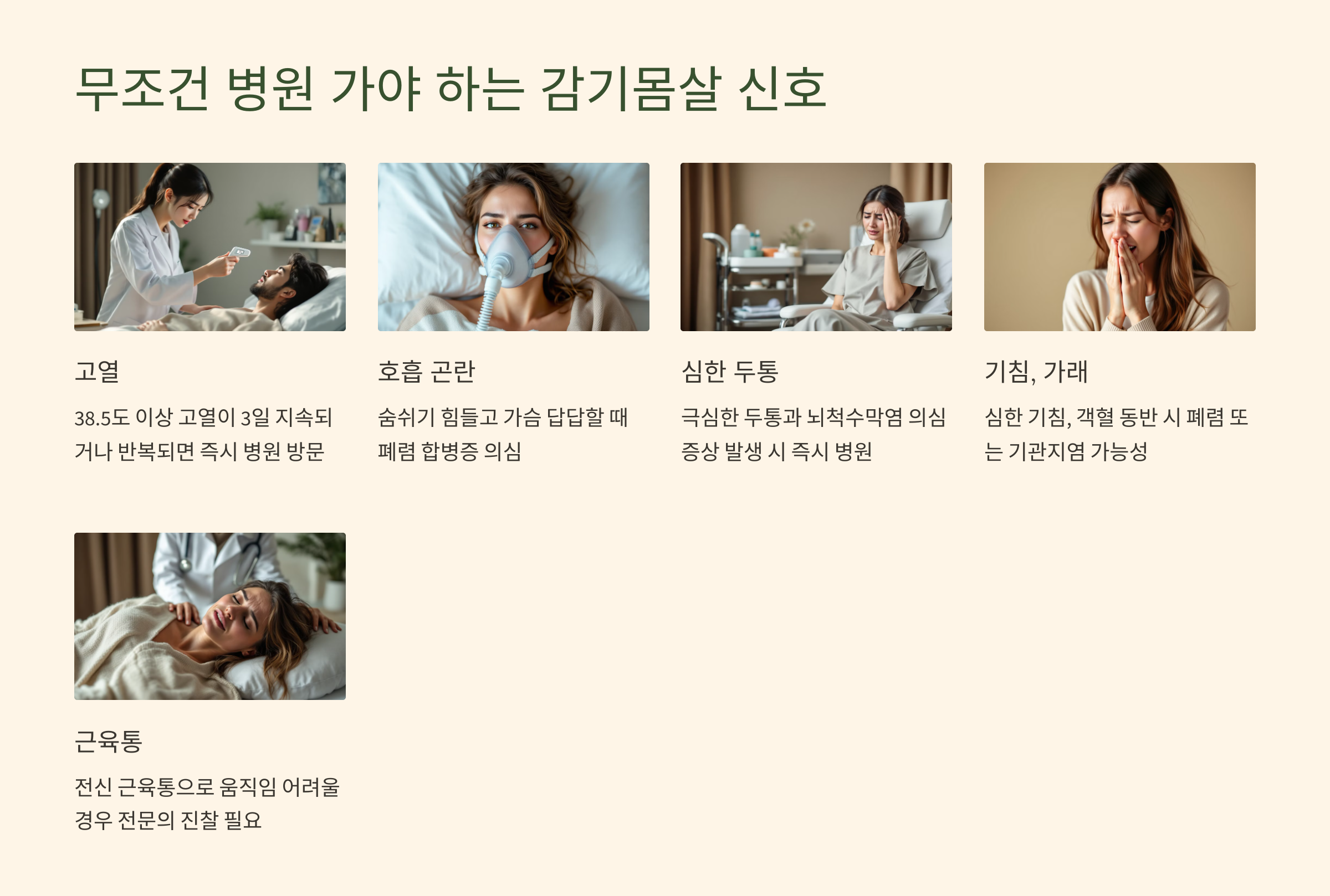 감기몸살은 대부분 자연적으로 회복되지만, 심한 경우 병원 진료가 필요할 수도 있어요. 특히 다음과 같은 증상이 있다면 병원에 가는 것이 좋아요.