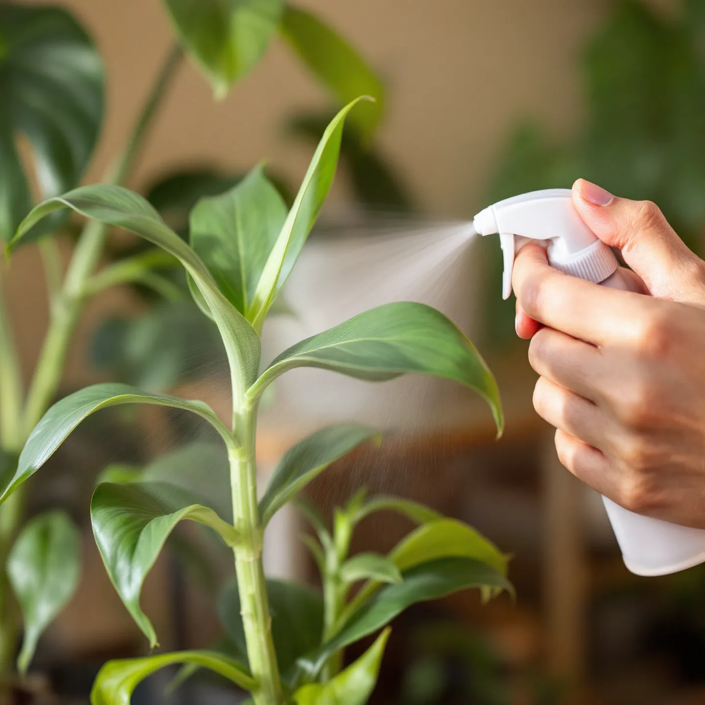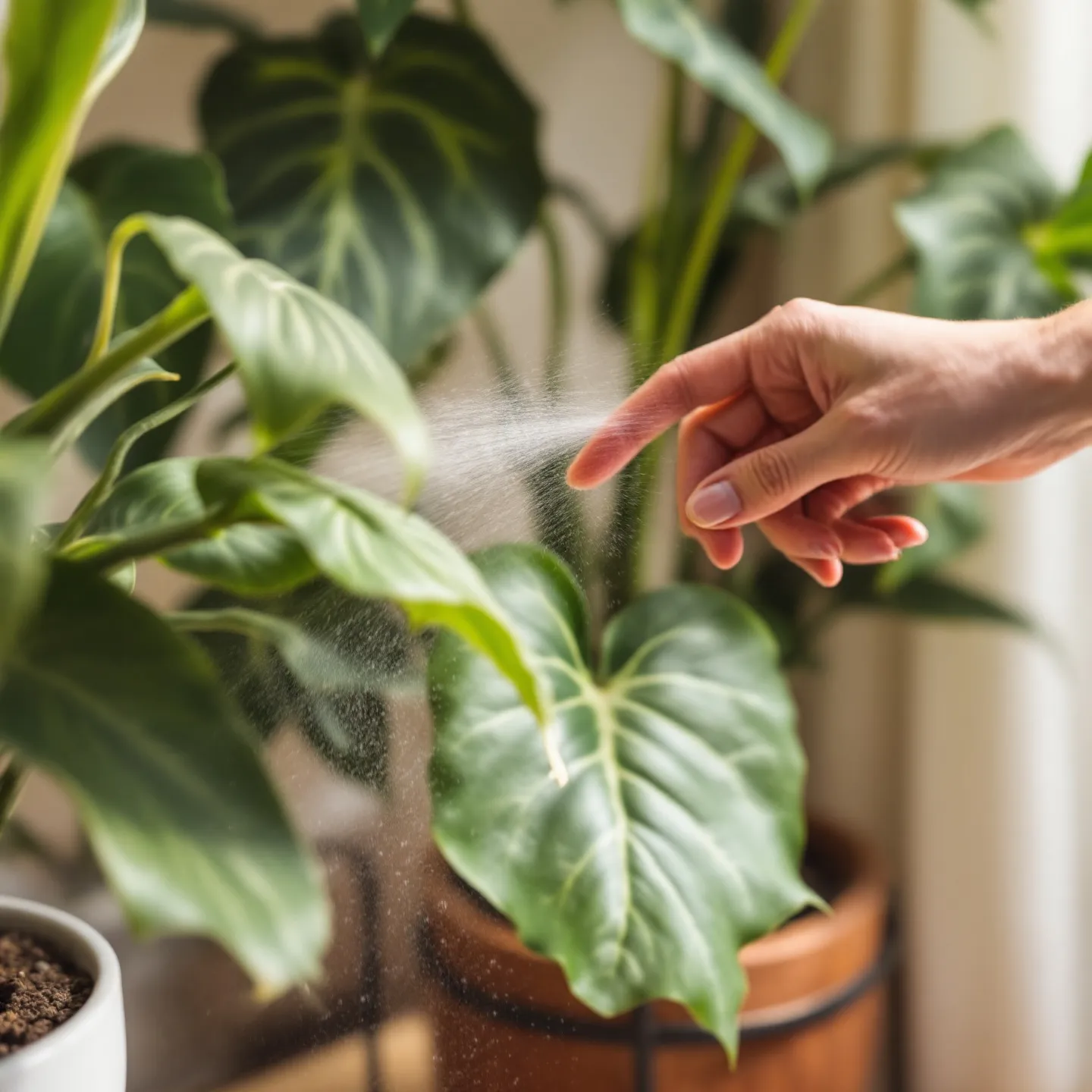 공기가 너무 건조하면 식물 잎도 쉽게 마를 수 있어요. 잎이 얇고 수분을 많이 필요로 하는 식물이라면, 하루 한 번 정도 분무기로 가볍게 물을 뿌려주는 것이 좋아요. 하지만 밤에는 분무하지 않는 것이 좋아요! 🌿