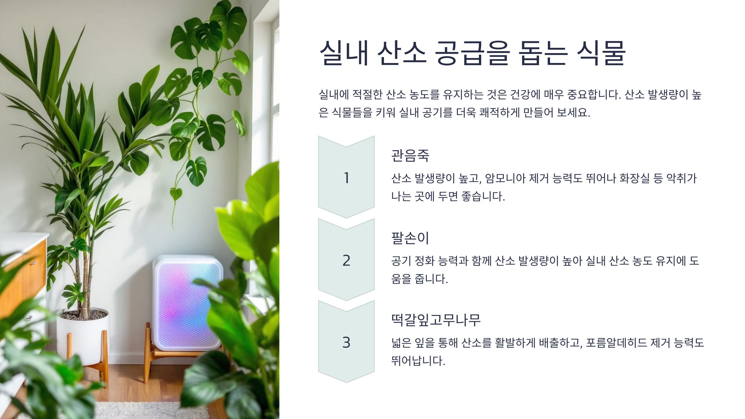이 식물들은 실내 공기를 신선하게 유지해 주며, 산소 공급을 원활하게 도와줘요. 특히 밤에도 산소를 배출하는 식물을 침실에 두면 숙면에도 도움이 된답니다.