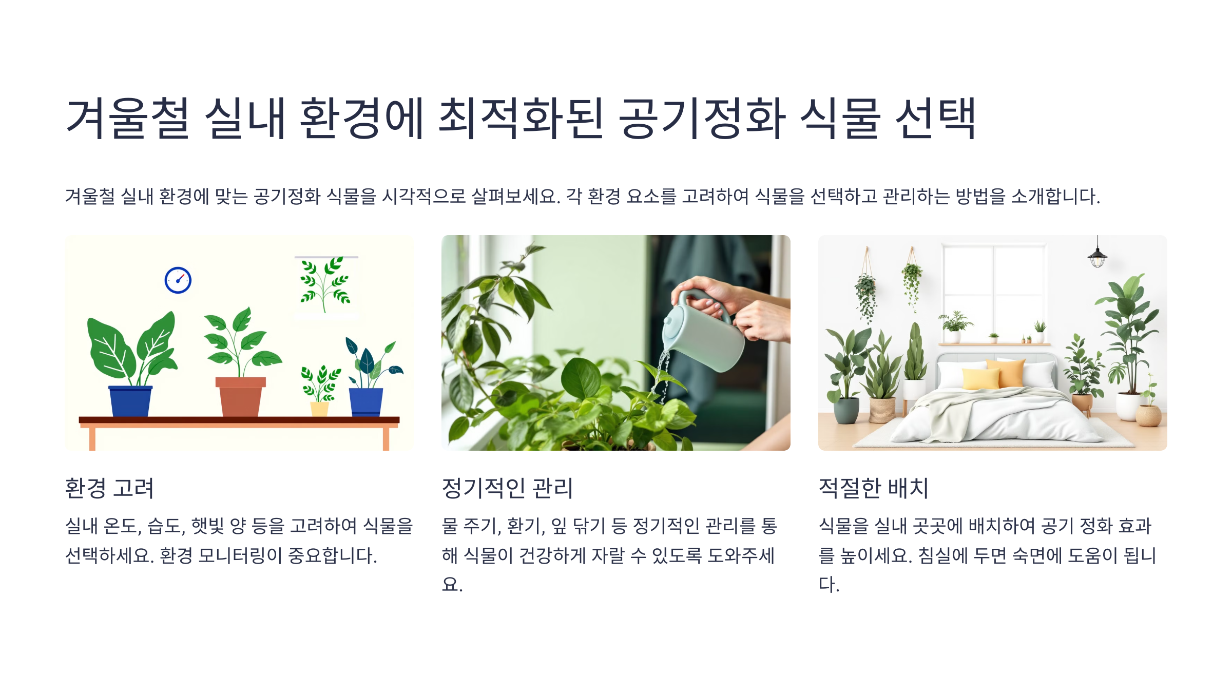 이 식물들은 겨울철 실내 환경을 보다 쾌적하게 만들며, 건강한 공기를 유지하는 데 도움을 줄 수 있어요.